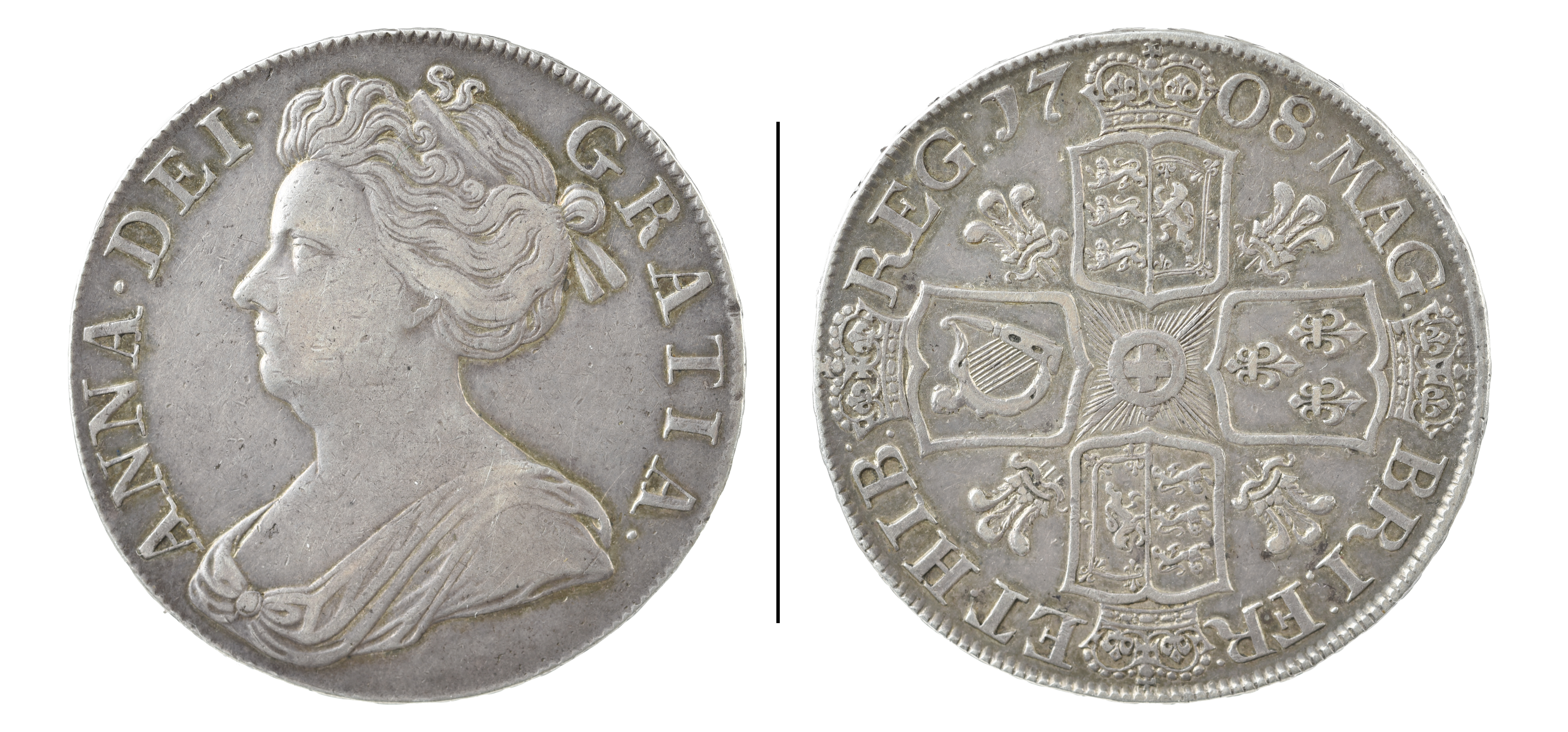 Anne, silver crown, 1708, second bust, rev. plumes in angles, edge SEPTIMO (S 3602), very fine, reverse much better, toned.