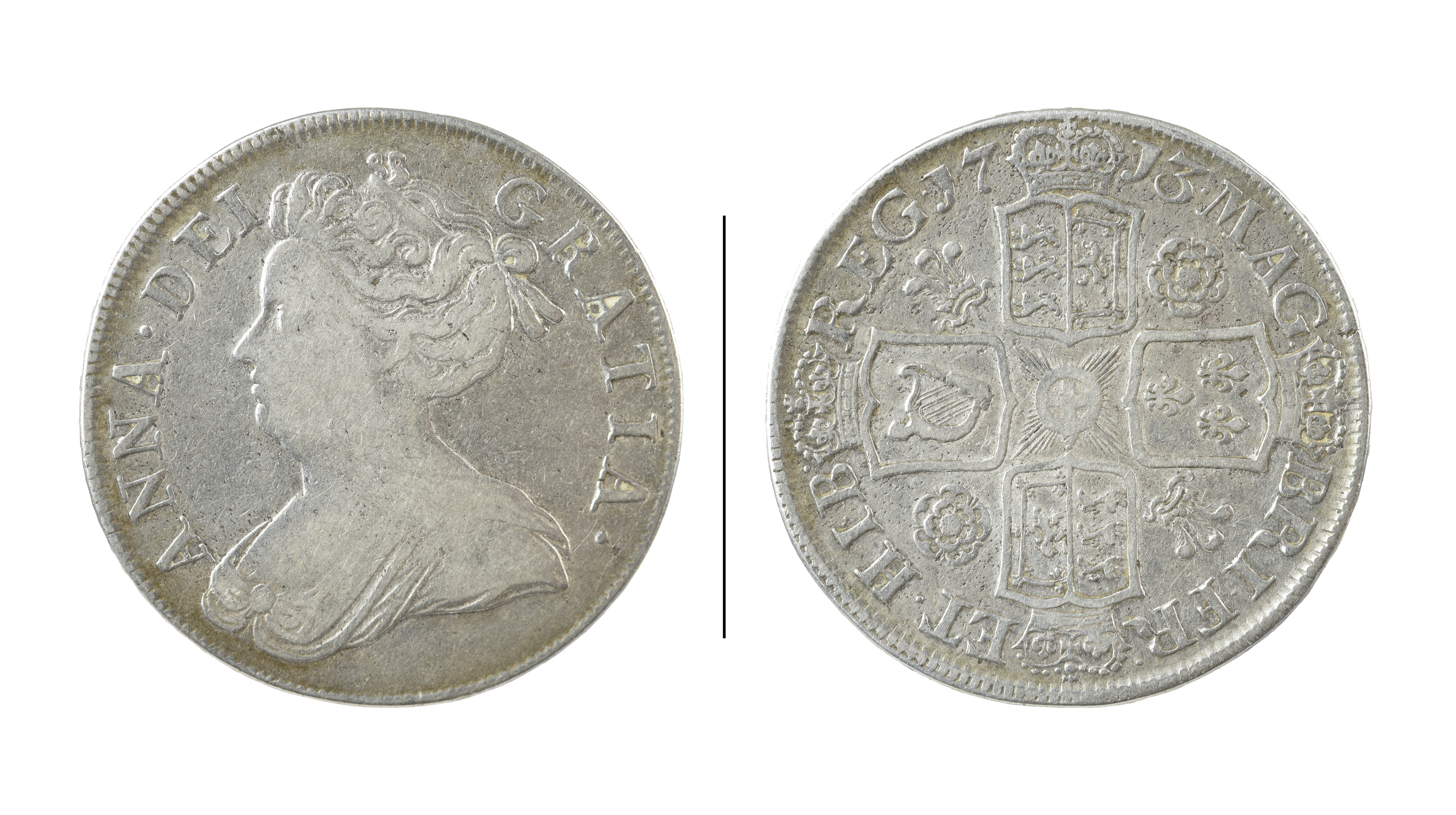 Anne, silver crown, 1713, third bust, rev. roses and plumes, edge DVODECIMO (S 3603), fine, reverse better.