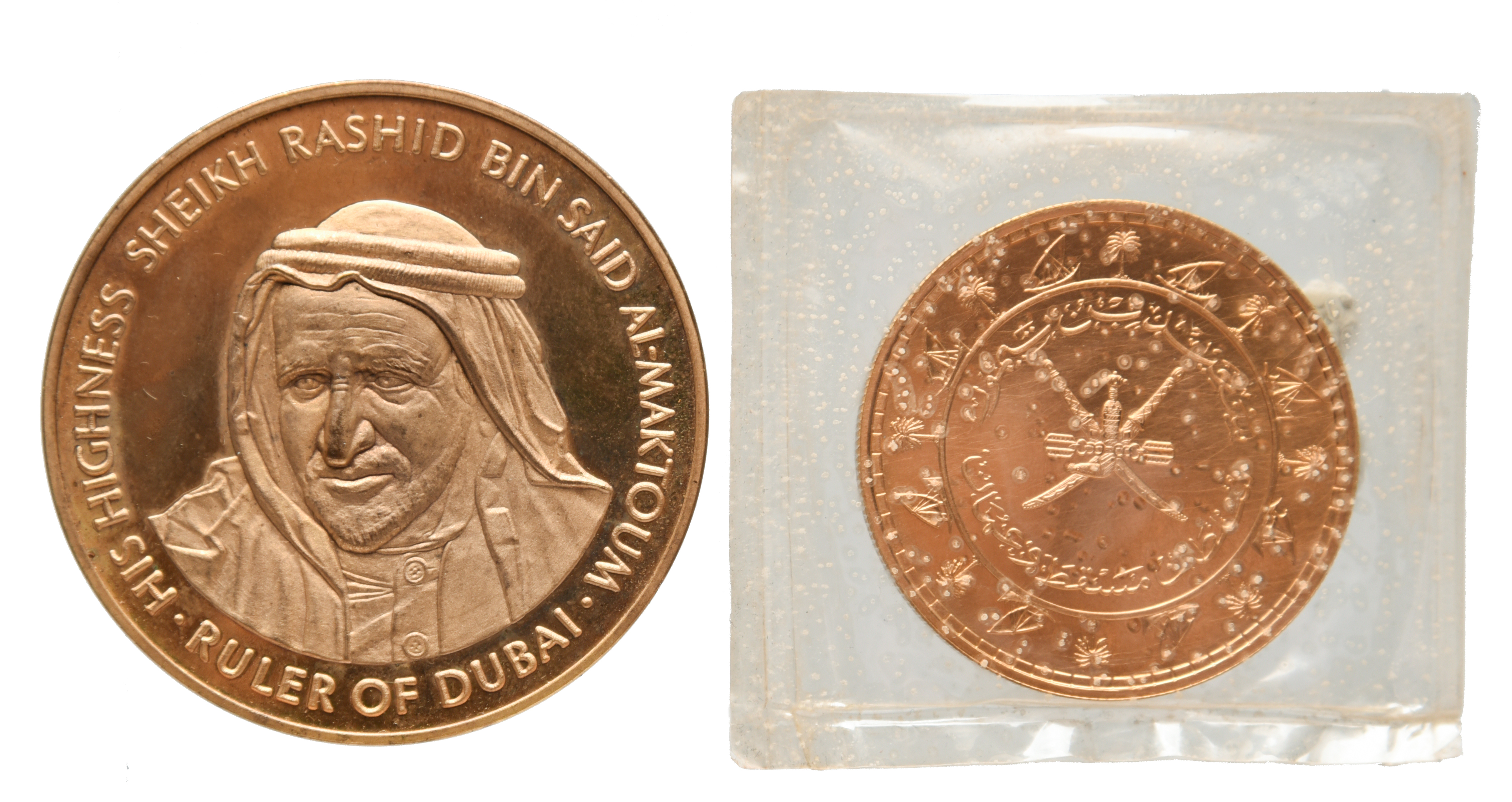 Sultanate of Muscat and Oman, gold rial, 1970, commemorative issue to mark the introduction of the new Saidi currency (KM 31b), cased with certificate and typed explanatory note, light hairlining, otherwise as struck; together with: Dubai, opening of the Intercontinental Hotel 1975, a gilt-metal commemorative medal, in Spink case, about as struck. [2]