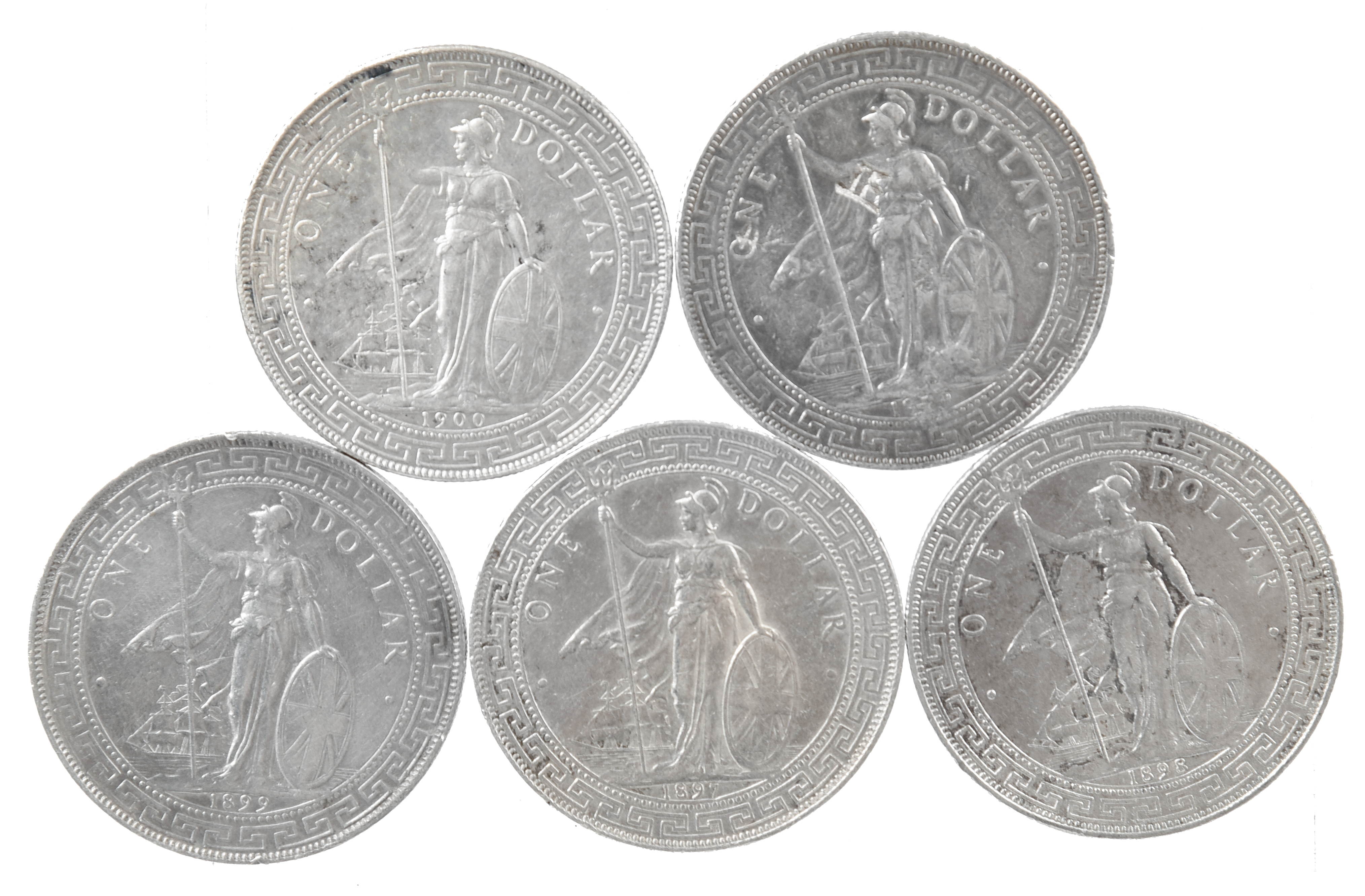 British Colonies, trade dollars (5), 1897B, 1898B, 1899B (2), 1900B (KM T5), all about very fine, one of the 1899 examples with chop marks to either side. [5]