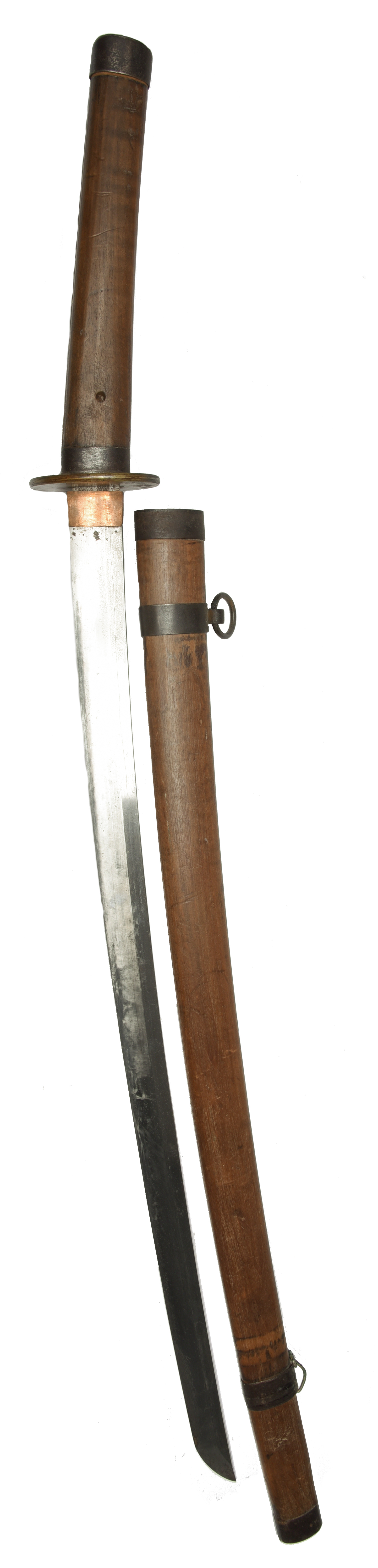 A Japanese sword, blade 25.25 in., hon-zukuri, plain copper habaki, nakago with two-character mei, plain brass tsuba, saya of plain wood with simple iron fittings, received from the surrendering Japanese forces in 1945 and of contemporary manufacture.