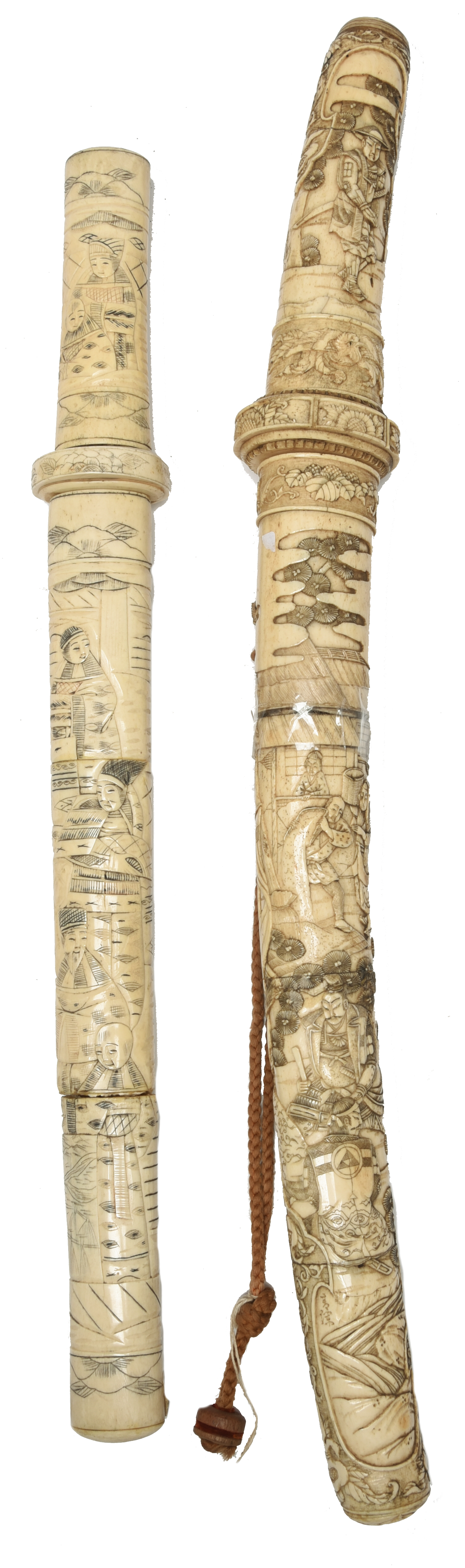A good Japanese bone mounted dagger (tanto), blade 11.5 in., plain brass habaki, bone tsuka and saya well carved with scenes involving a woman in a supplicant attitude before a group of warriors, peasants beyond, all set against architectural and naturalistic elements; and another dagger of similar type. [2]