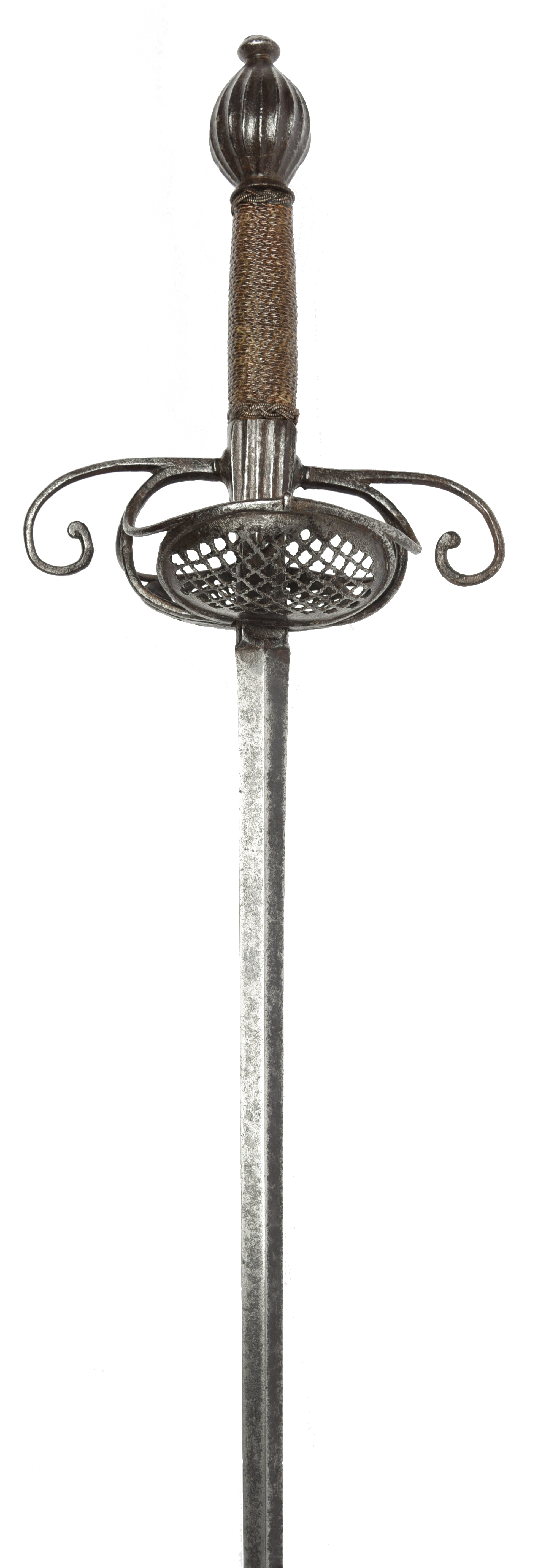 A 17th century English duelling rapier, slender diamond-section blade 36.5 in. steel guard formed of two oval shells pierced in a lattice pattern and supported by slender arms and side rings descending from the fluted quillon block, slender scroll-terminal quillons, fluted ovoid pommel with button finial, grip bound with braided wire between Turks' head knots, c. 1630.