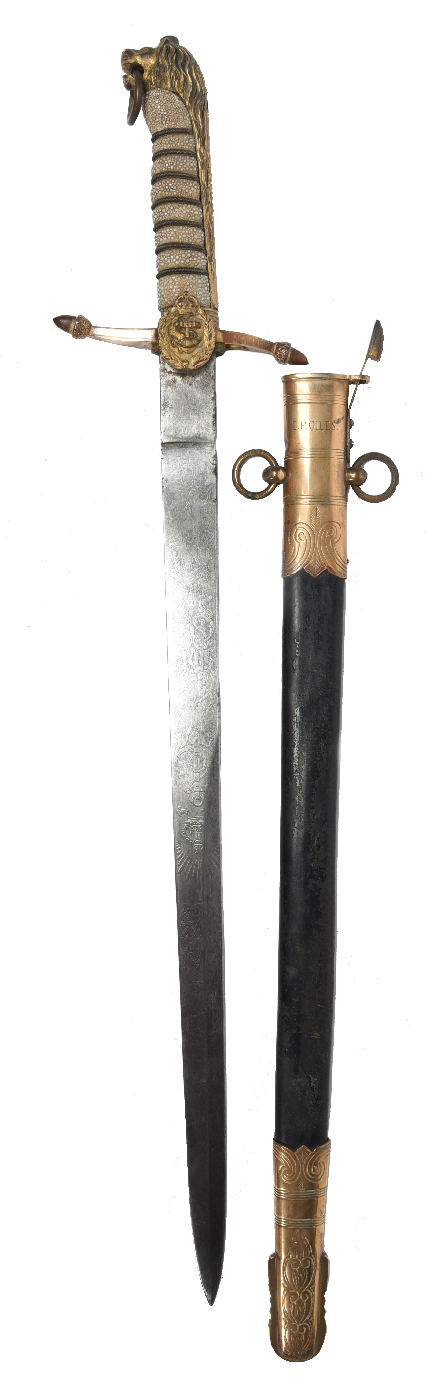 A British Royal Naval Midshipman's dirk, George VI, etched blade 17.75 in., gilt-brass hilt with lion head pommel and fouled anchor to the langet, brass mounted leather scabbard, the locket incorporating a spring catch and engraved 'C.P. GILES.'.