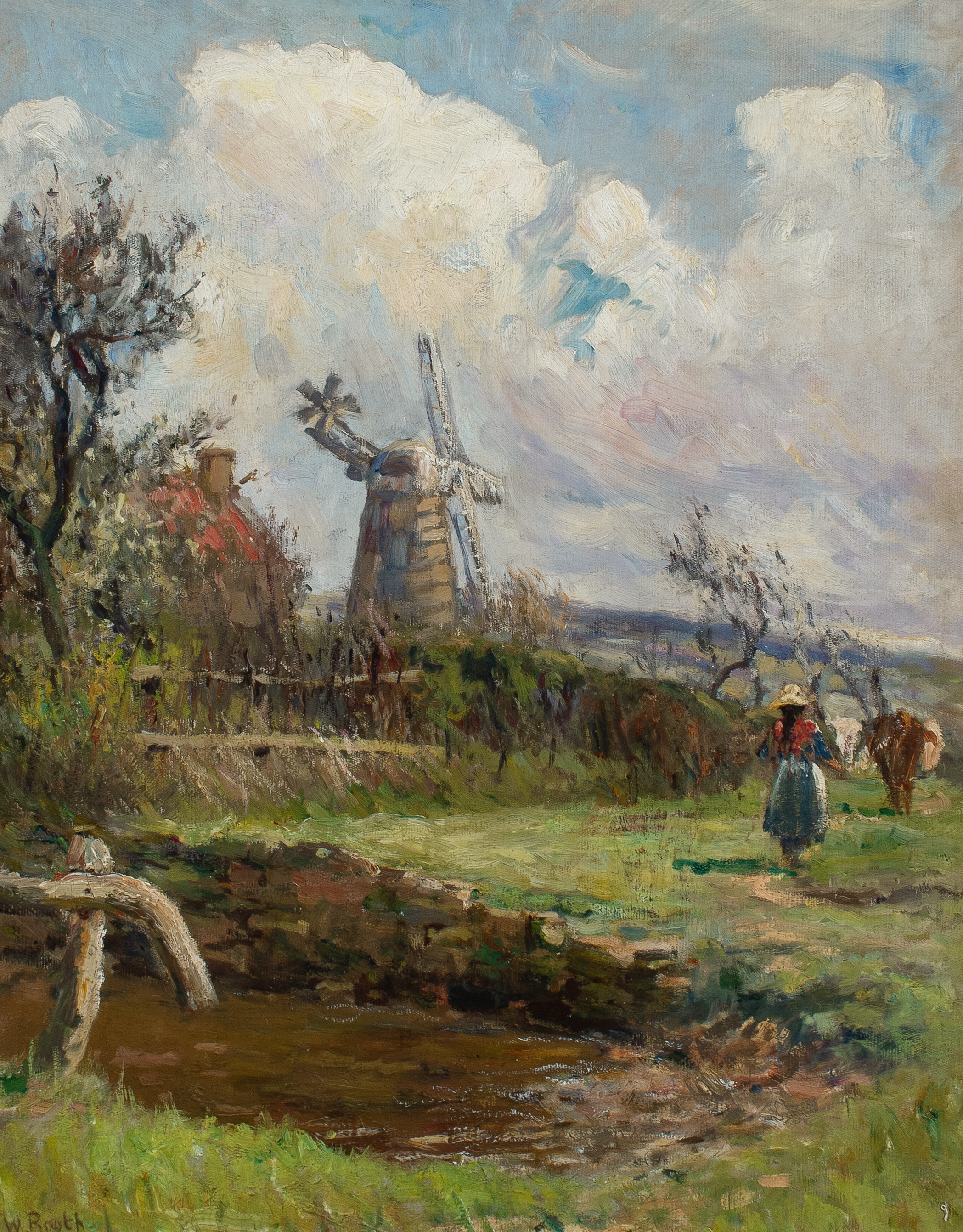 Landscape with a woman and cattle by a pond, a windmill beyond