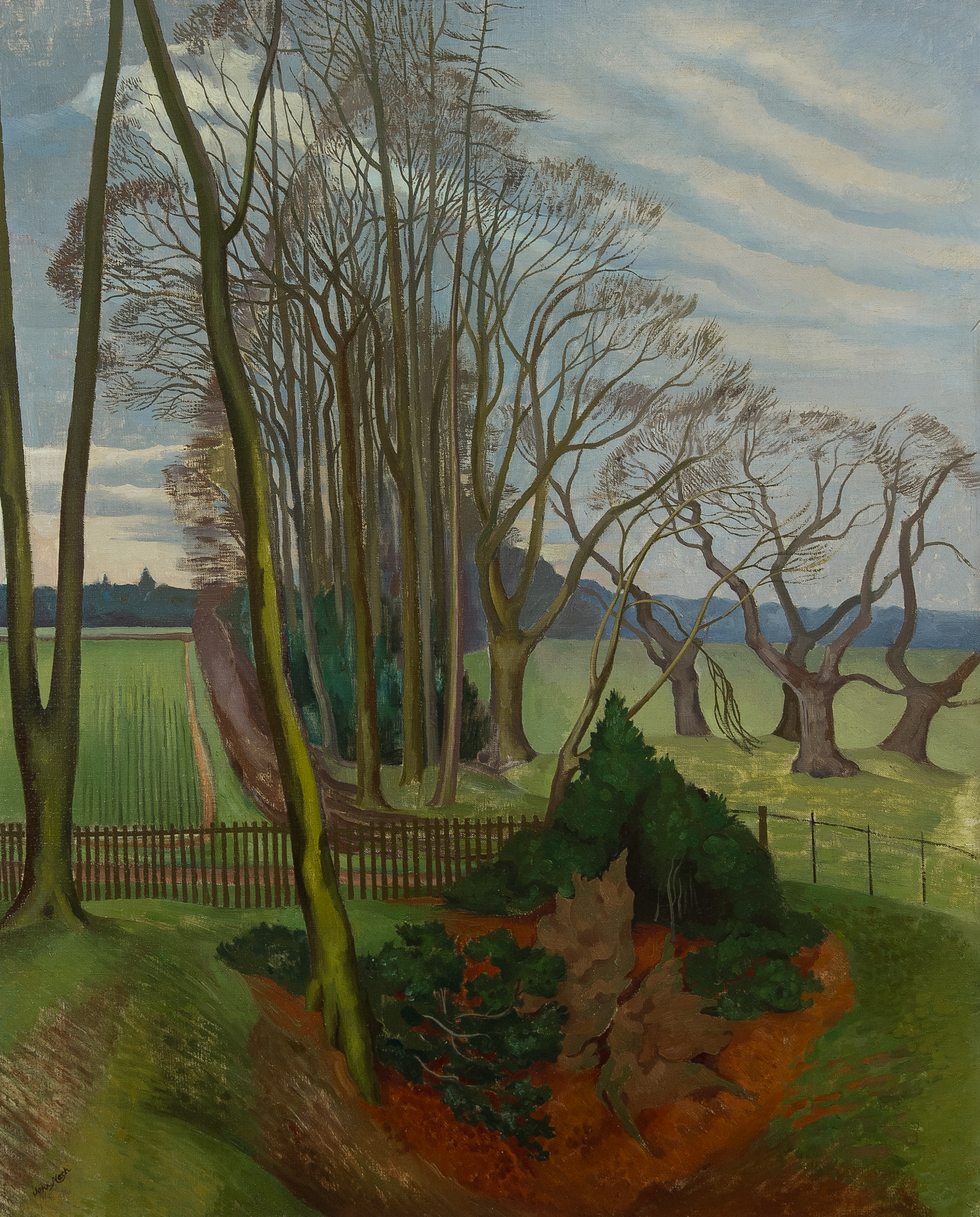 John Nash has been described as “an English landscape painter of unique importance”. This scene was just a few miles from Nash’s home in Meadle, Buckinghamshire, and he depicted the landscape of his beloved Chilterns repeatedly throughout his career. Despite the traditional subject matter the composition is inventive and unusual, with the central copse splitting the work in two, and the bold reds and greens contrasting with the subtle rendering of the sky. It is a painting that demonstrates that although in many ways Nash was the quintessential English landscape painter, underlying his work was a rare sophistication and brilliance