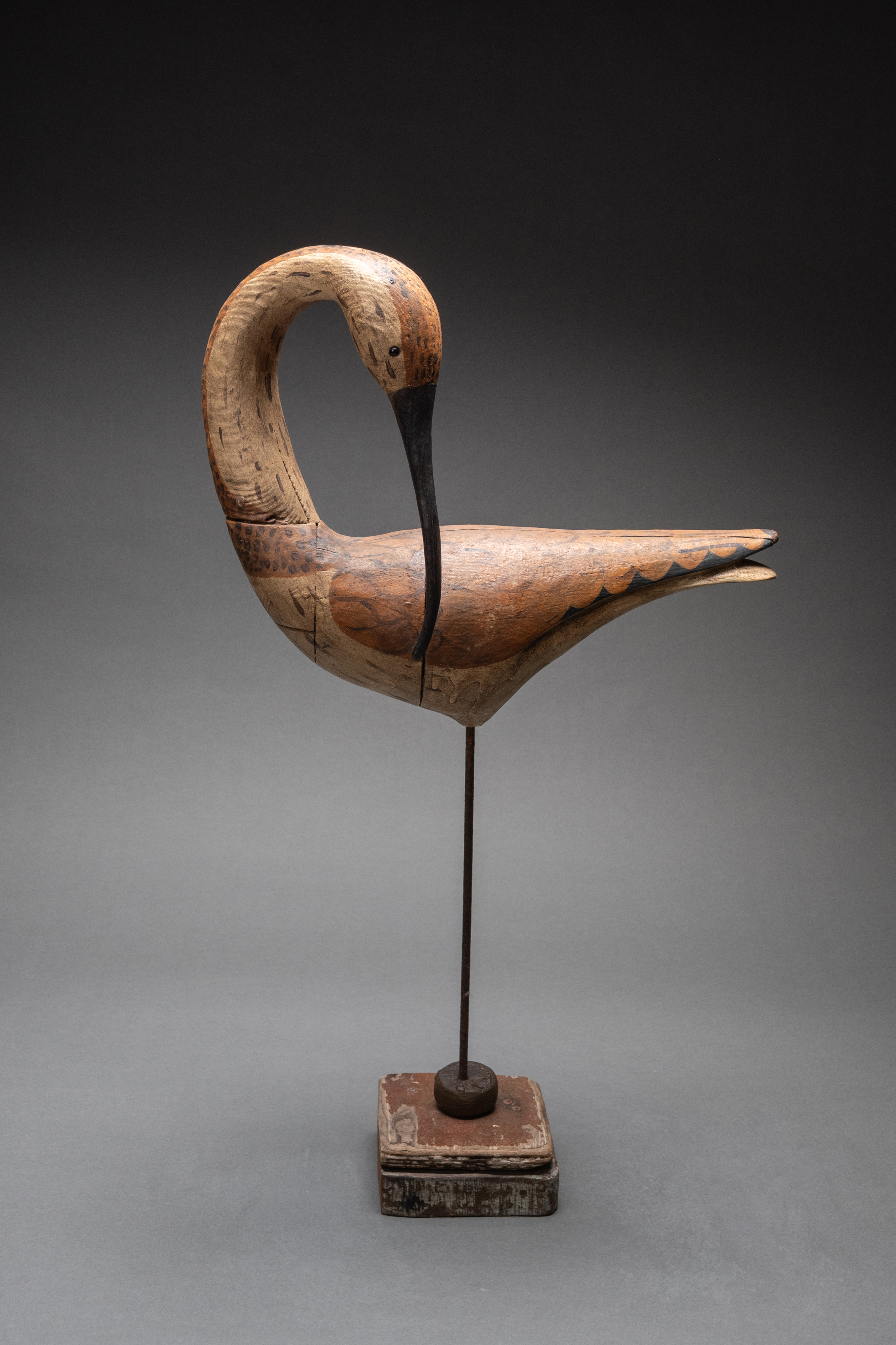 Painted wood with glass bead eyes on a driftwood base with metal support