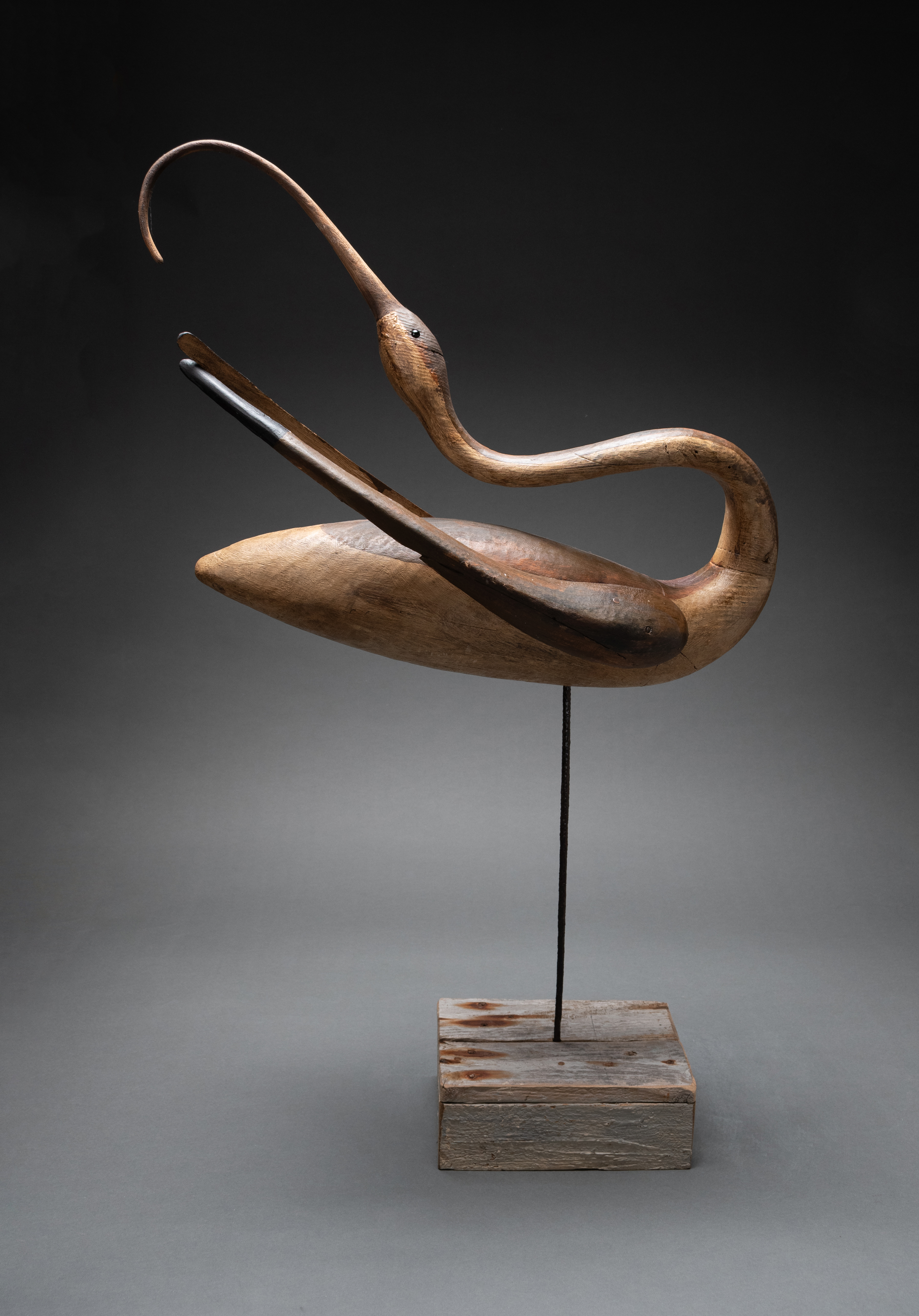 Painted wood with glass bead eyes on a driftwood base with metal support