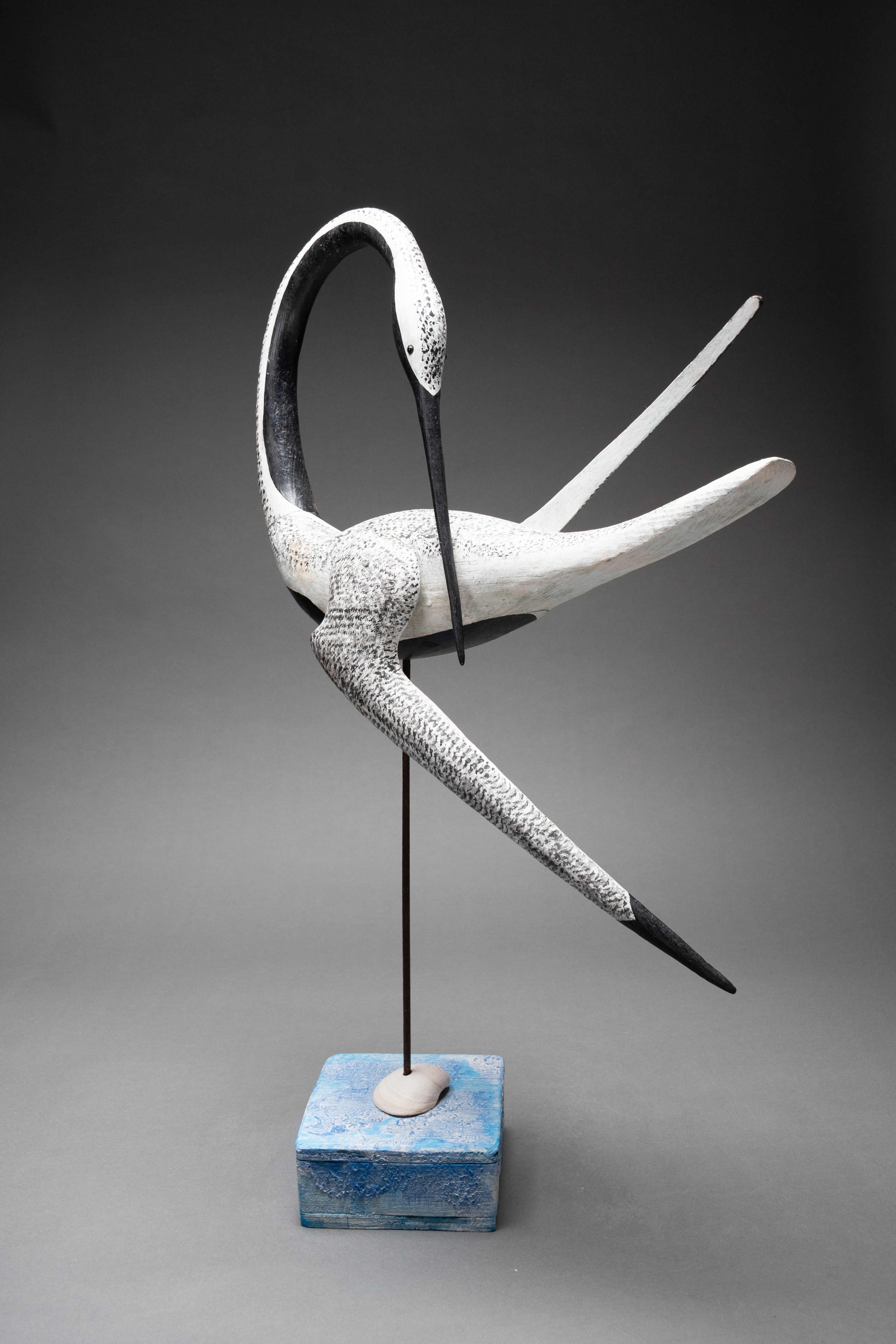 Painted wood with glass bead eyes on a painted driftwood base with metal and sea shell support