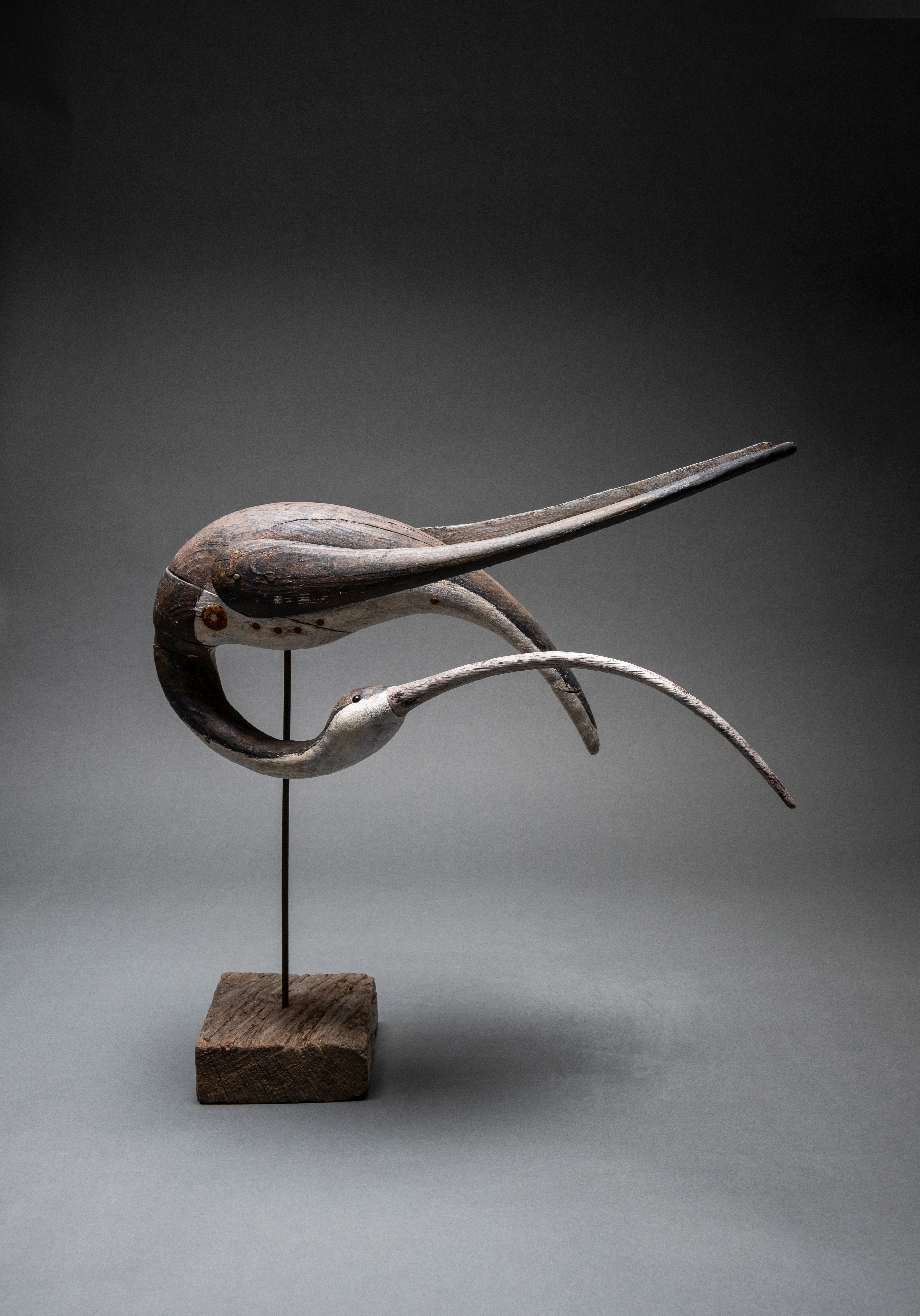 Painted wood with glass bead eyes on a driftwood base with metal support