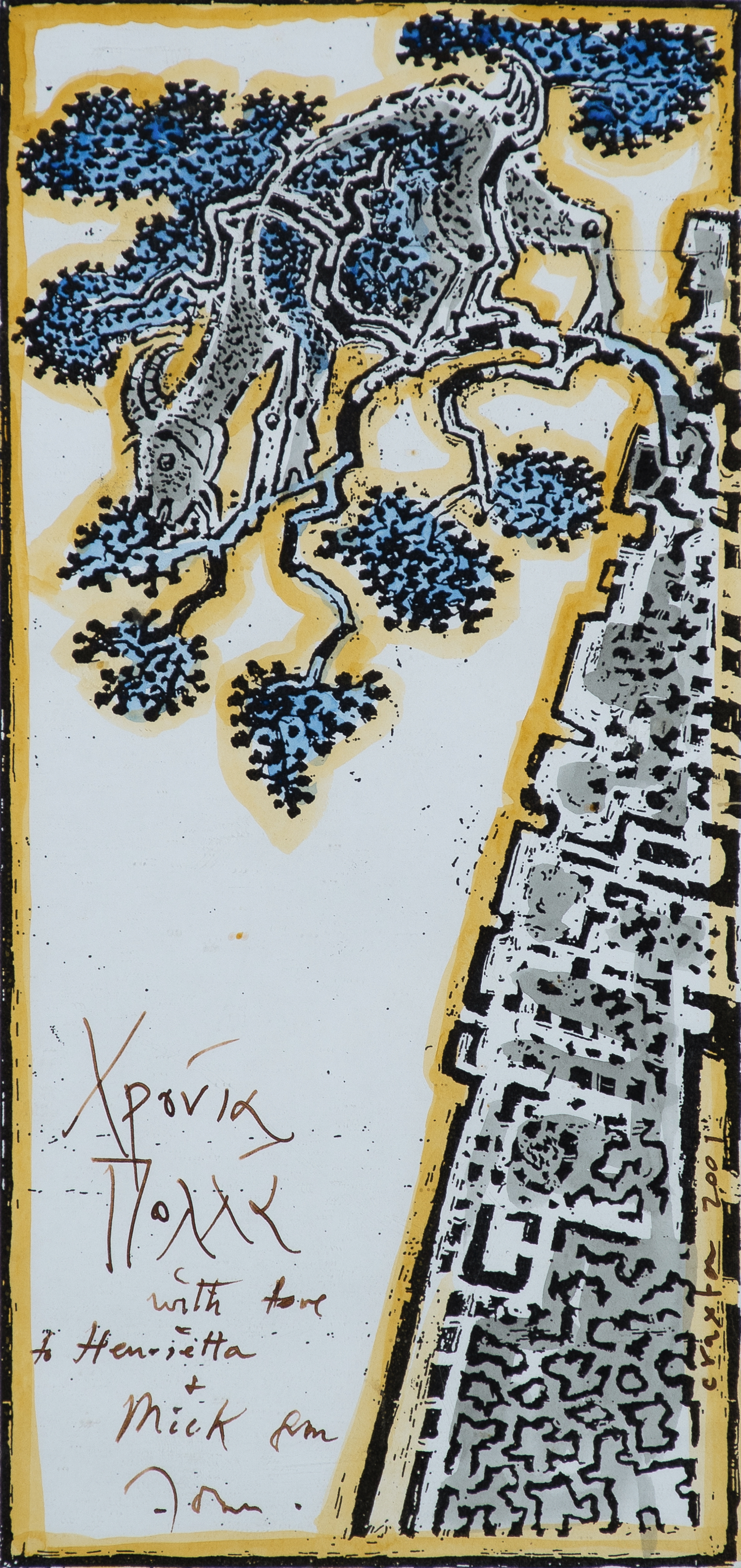 Signed and dated craxton 2001 (lower right) and further signed and inscribed Χρονια/Πολλα [Happy Birthday]/with love/to Henrietta/&/Mick from/John (lower left)