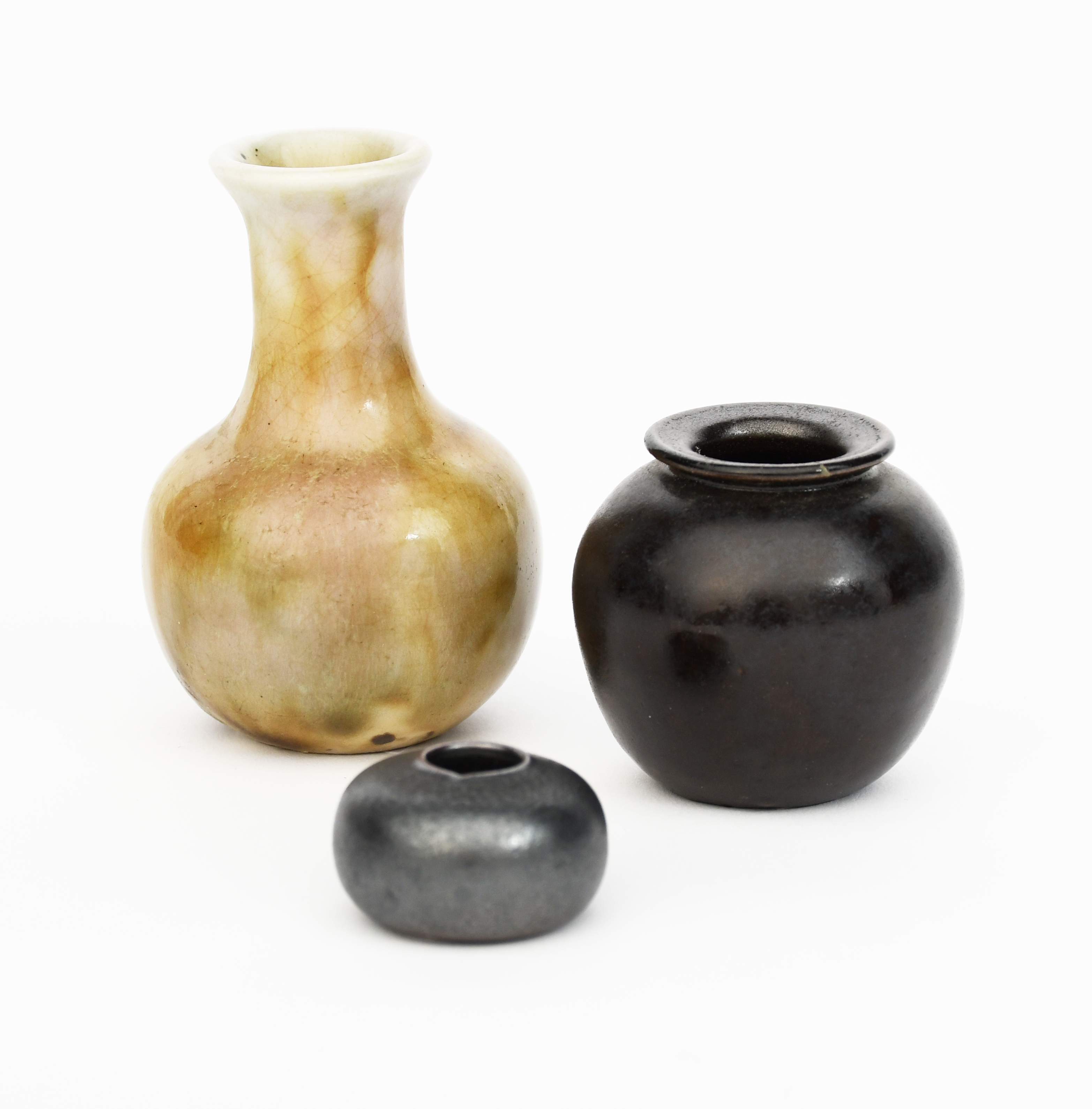 A Martin Brothers miniature gourd vase by Edwin & Walter Martin, compressed form covered in a chestnut glaze, a Martin Brothers miniature ovoid vase and a Martin Brothers solifleur vase, 10-9 Martin Bros, London & Southall, 3cm diam. (3)