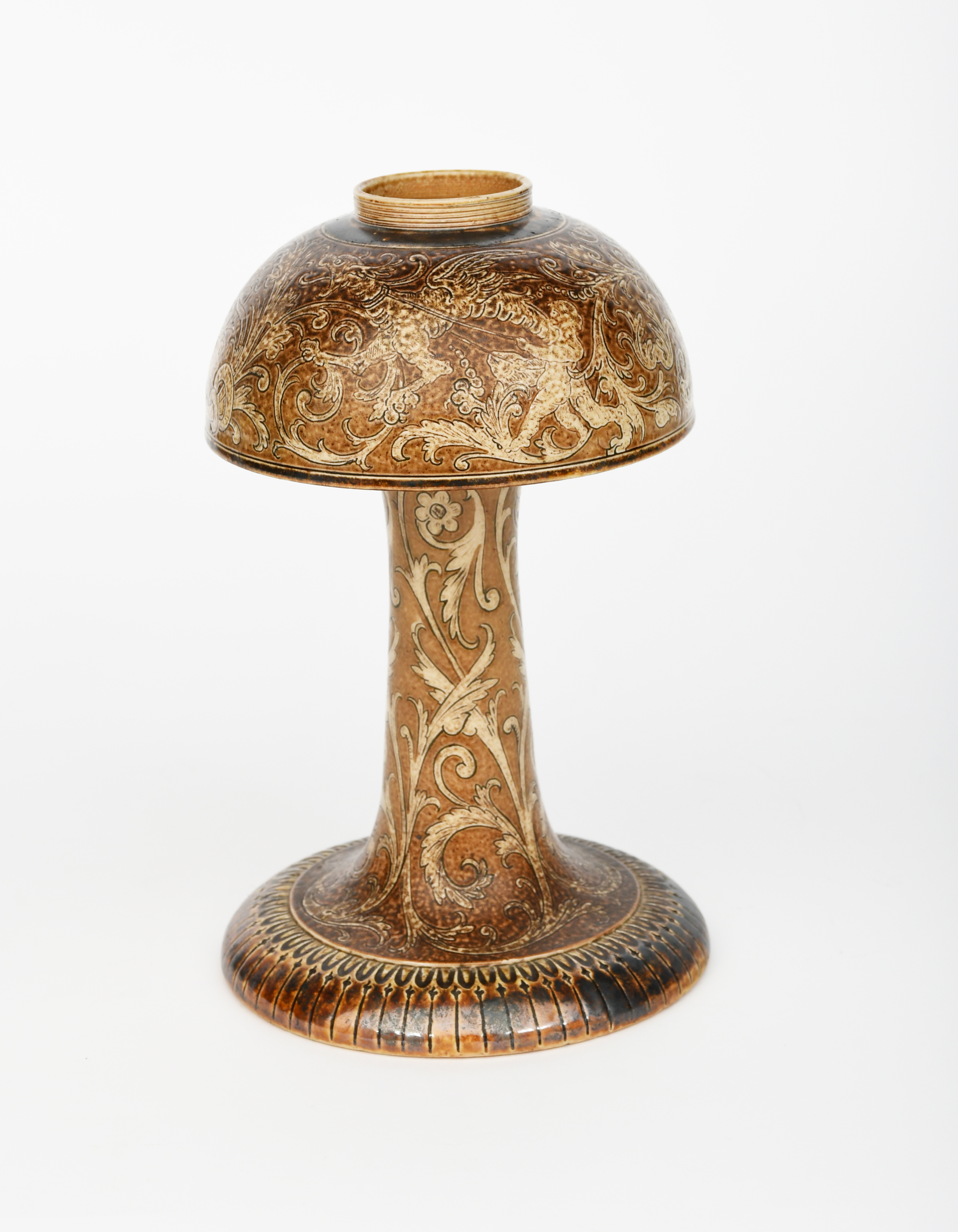 A Martin Brothers stoneware oil lamp base by Edwin & Walter Martin, dated 1888, swollen form on flaring conical base, incised with a figure holding a chained dragon whilst two other young men ride dragons, in a scrolling foliate ground, glaze ochre and tan, the stem with scrolling foliage, incised 1-1888 Martin Bros London & Southall, firing crack to base, 24cm. high