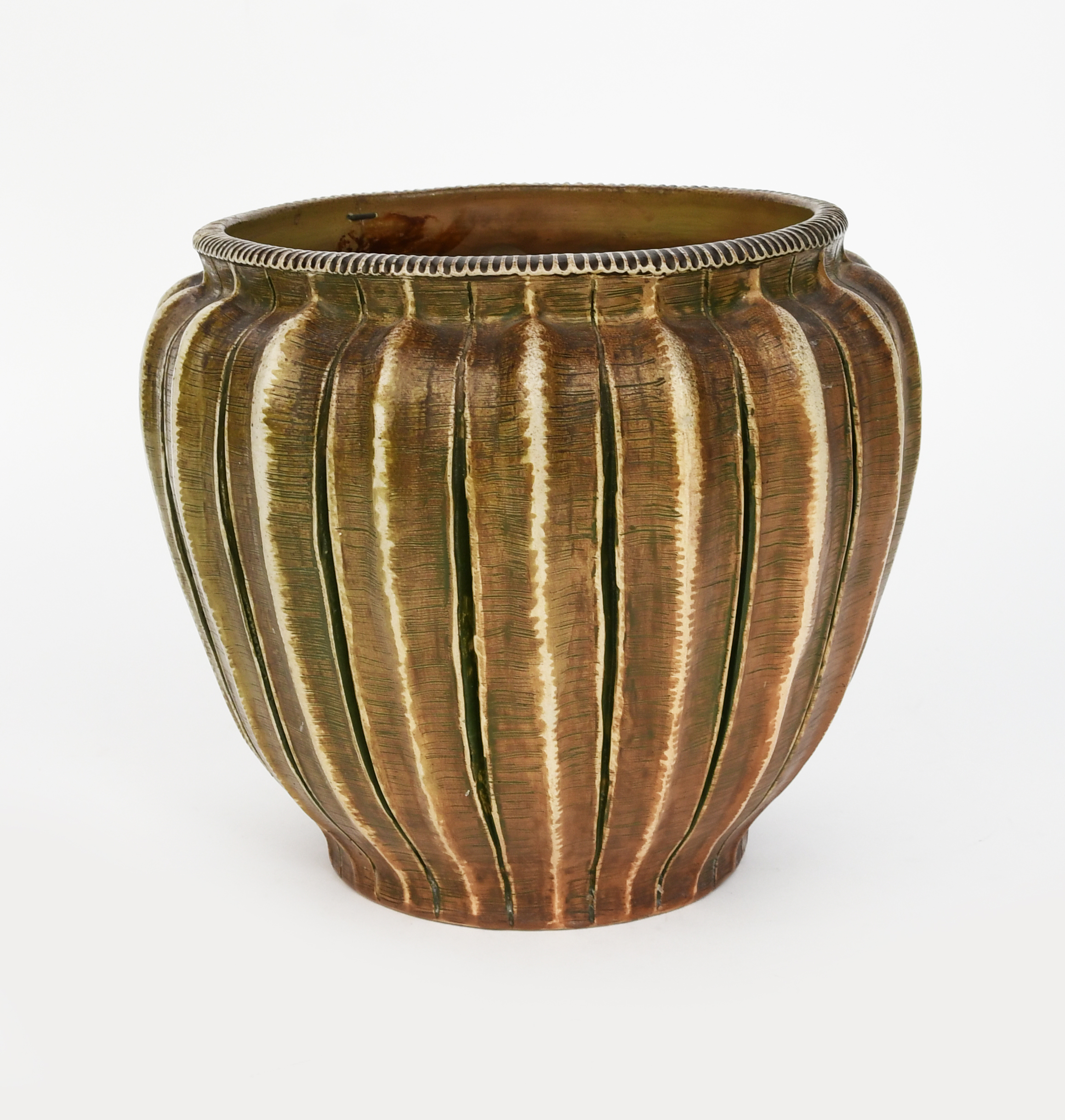 A large Martin Brothers stoneware gourd jardiniere by Edwin and Walter Martin, dated 1899, shouldered, ribbed form with finely incised detail, glazed ochre, highlighted with green on an oatmeal ground, incised 2-1899 Martin Bros, London & Southall, restored, 23.5cm. high