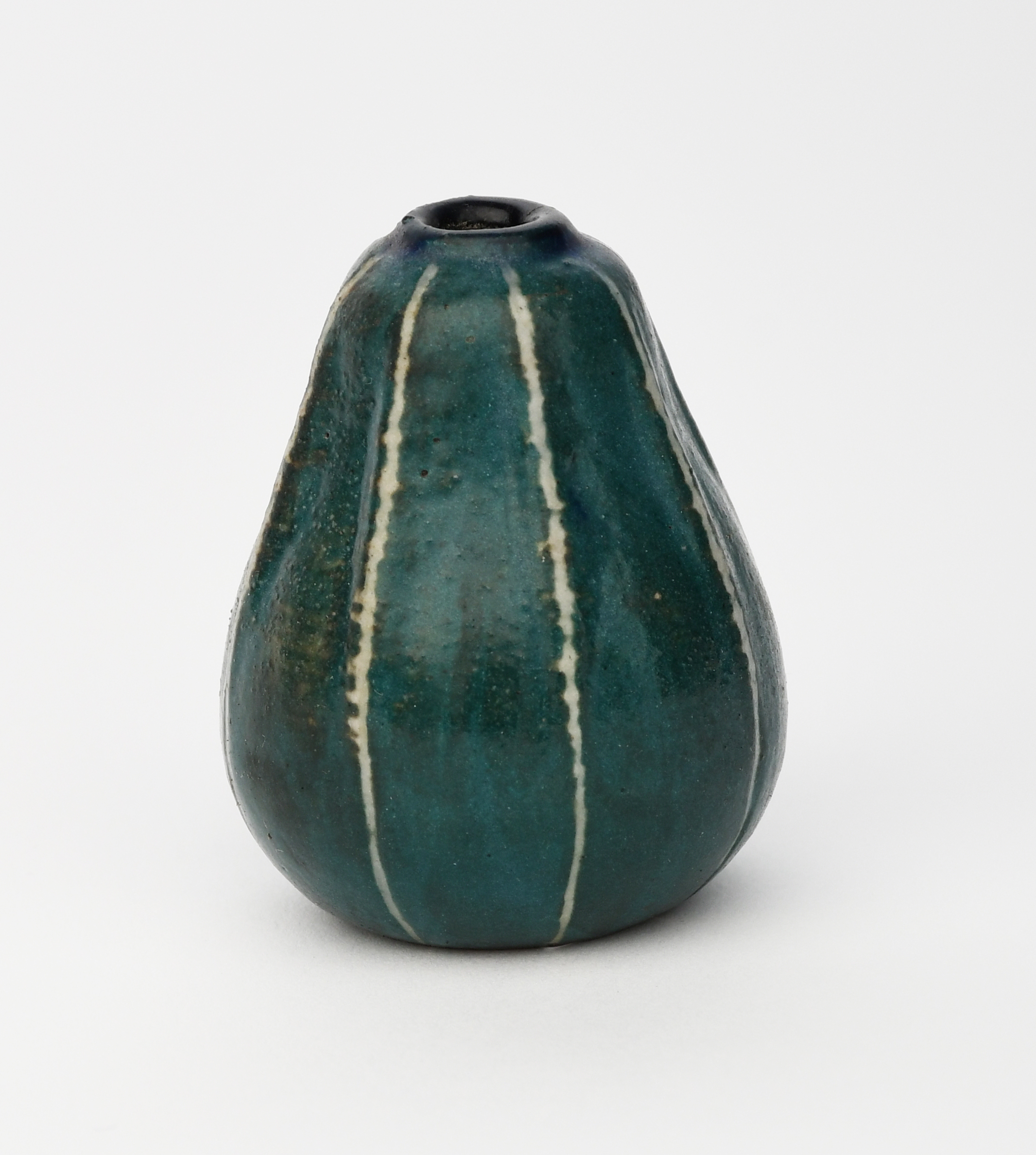 A Martin Brothers stoneware miniature gourd vase by Edwin and Walter Martin, ovoid with tapering neck, ribbed form, covered in a green and blue glaze, incised indistinct date (possibly 1900), Martin Bros, London, 5.5cm. high