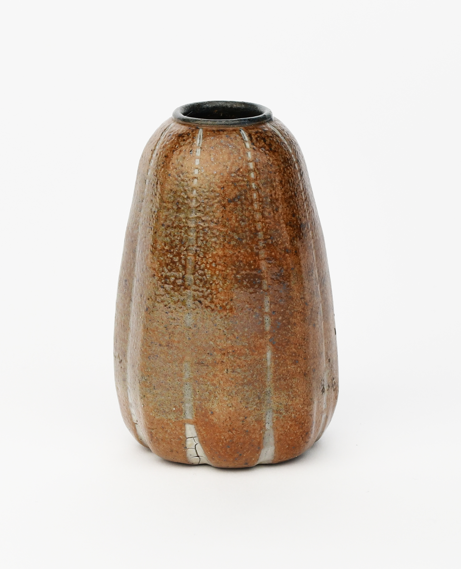 A Martin Brothers stoneware gourd vase by Edwin and Walter Martin, dated 1908, tapering, ribbed cylindrical form, glazed tan with white highlights, incised 1-1908 Martin Bros London & Southall, 9.3cm. high