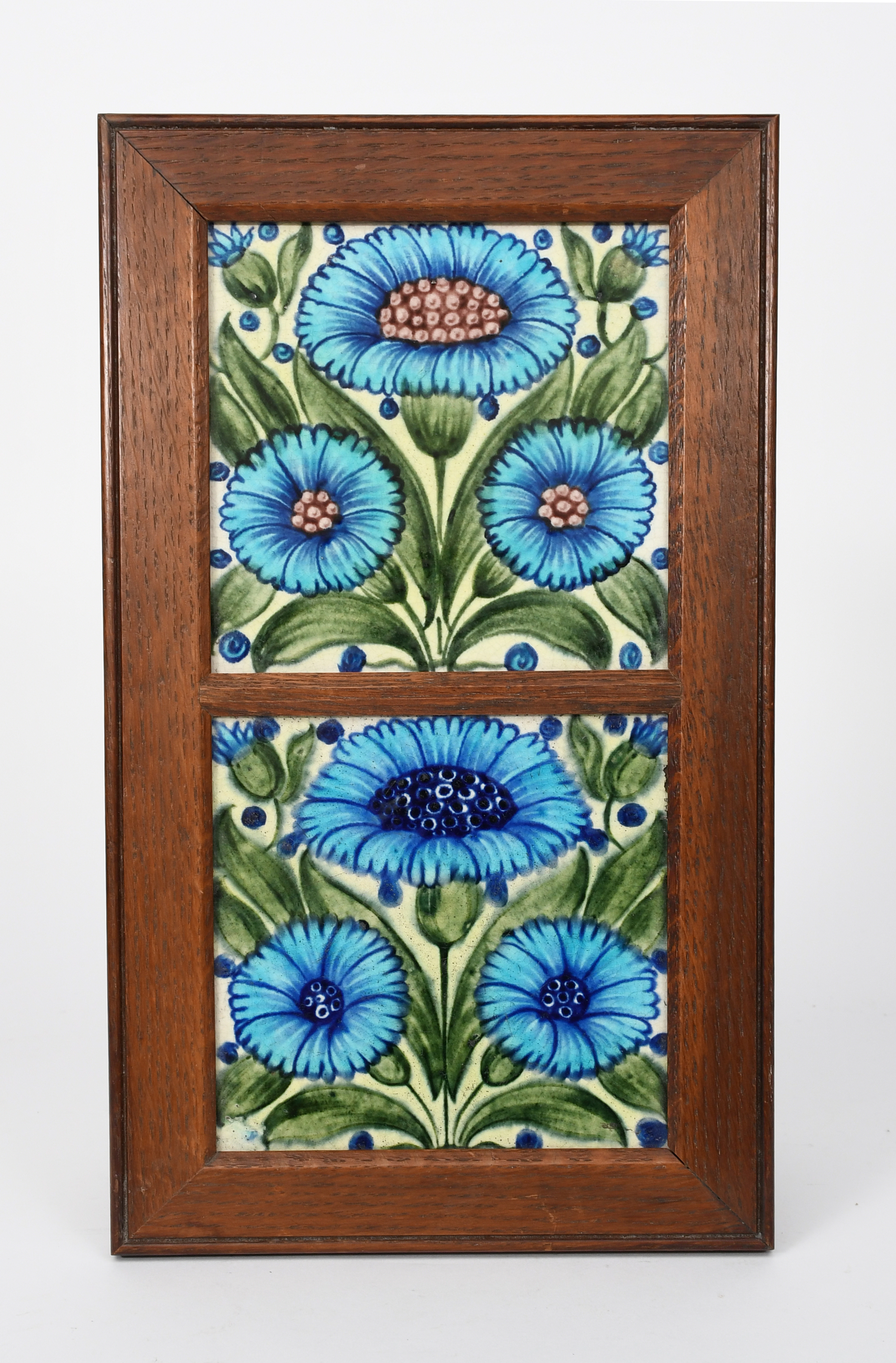 A pair of William De Morgan Bedford Park Daisy tiles, painted in shades of blue, green and aubergine on a white ground, framed, impressed marks, 15cm. square (tiles)