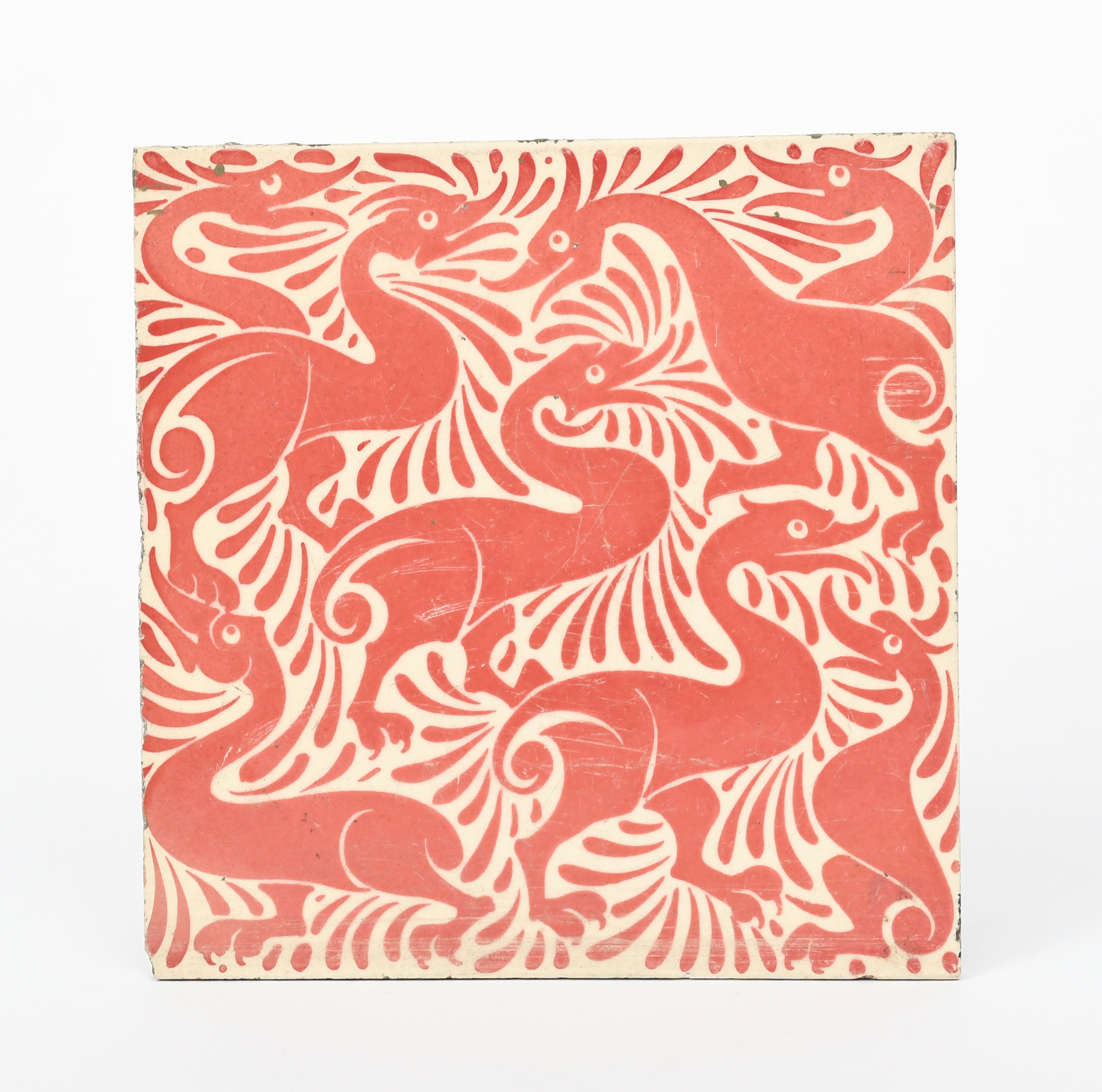 A William De Morgan Fantastic Ducks tile, painted with birds amongst foliage in ruby on a cream