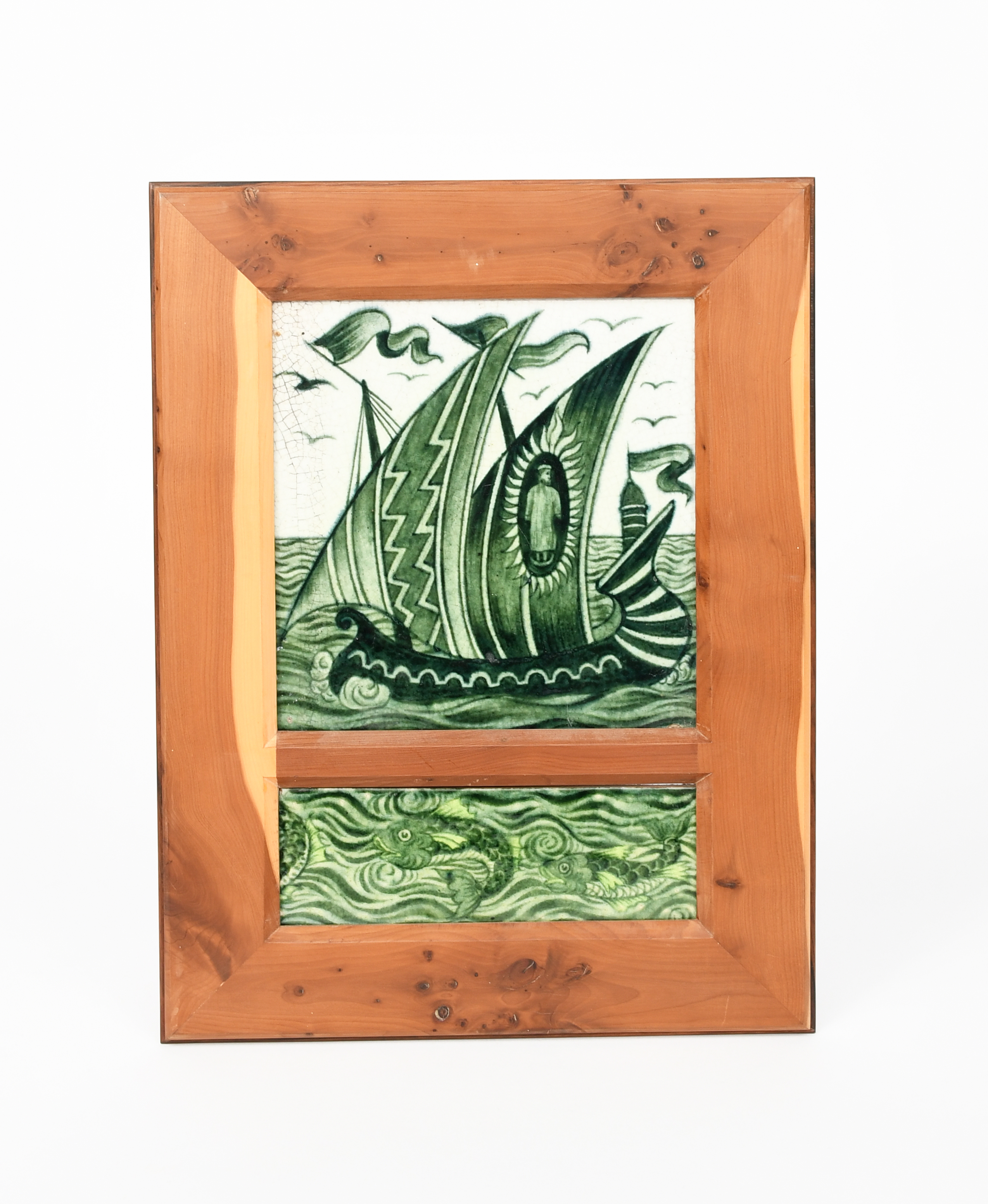 A William De Morgan Sands End Pottery Galleon tile, painted with a ship at sail on calm water, in green on a white ground, above a scaly fish spacer tile, in wooden frame by Peter Cornish impressed factory mark, 15.5cm. square (tile)