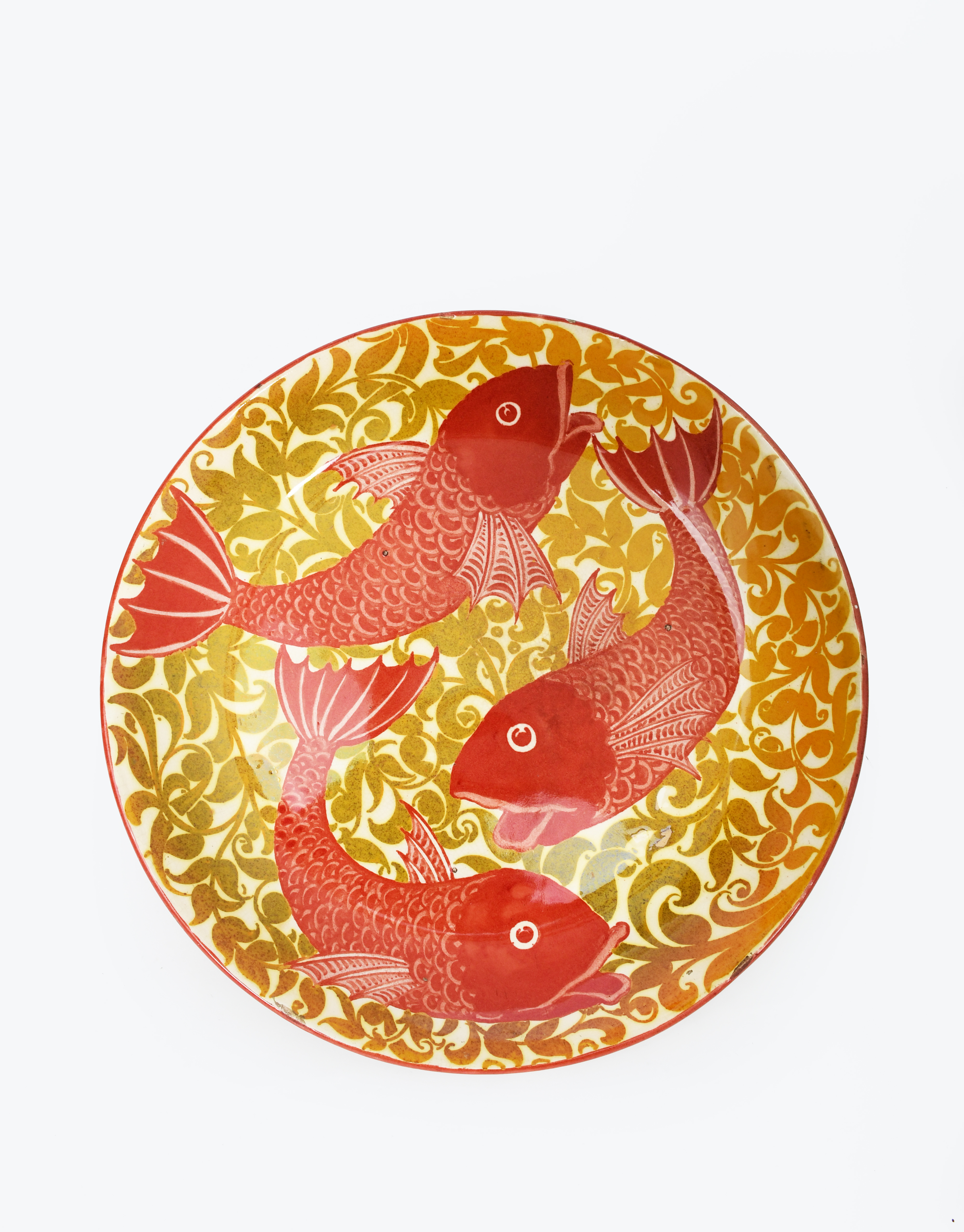 A William De Morgan Fish charger, painted with three large scaly fish before scrolling foliage
