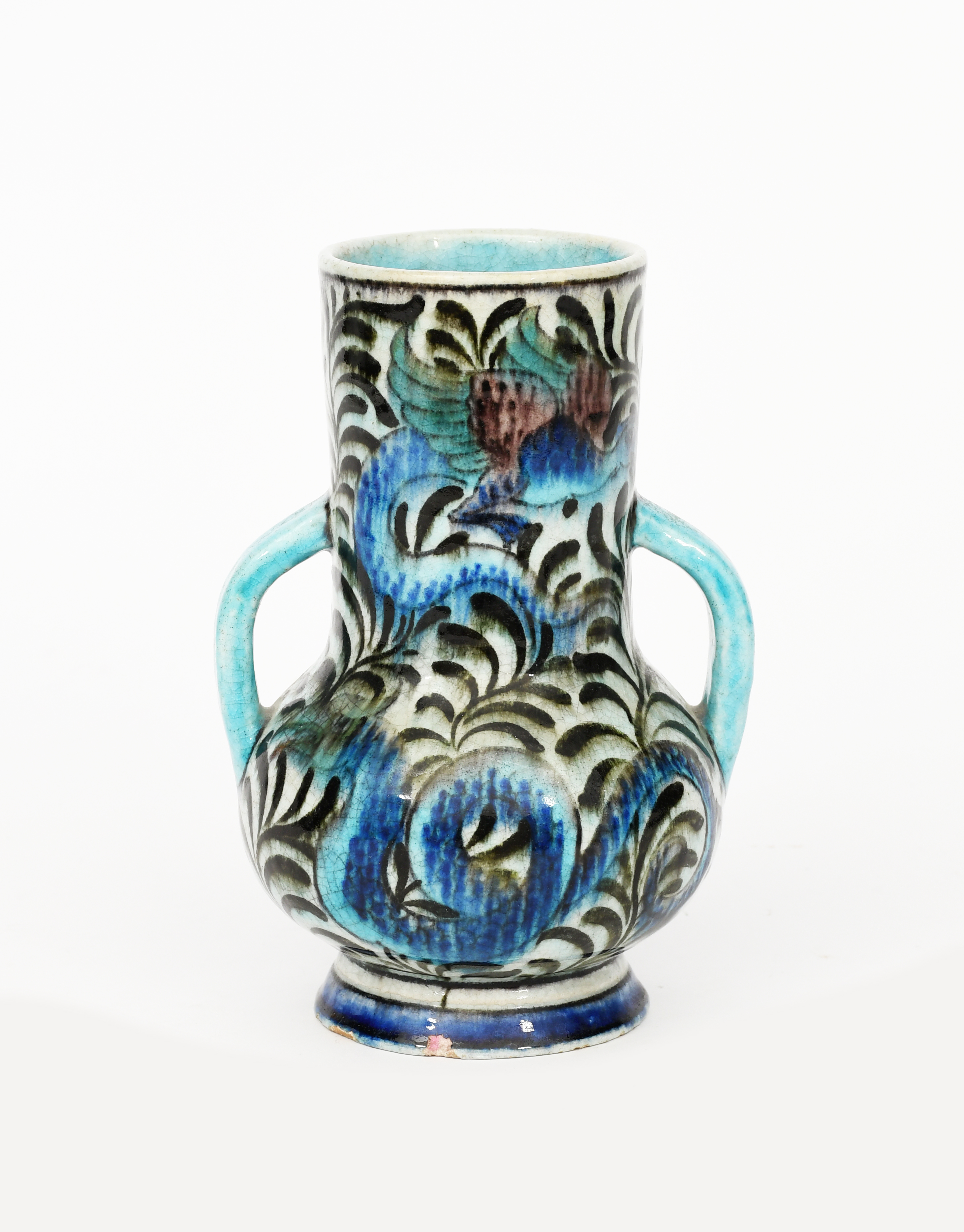 A William De Morgan Persian twin handled vase, ovoid with cylindrical neck, painted with a serpent and winged dragon in blue, turquoise, green and aubergine on a white ground, unsigned, small chips to foot, 22cm. high