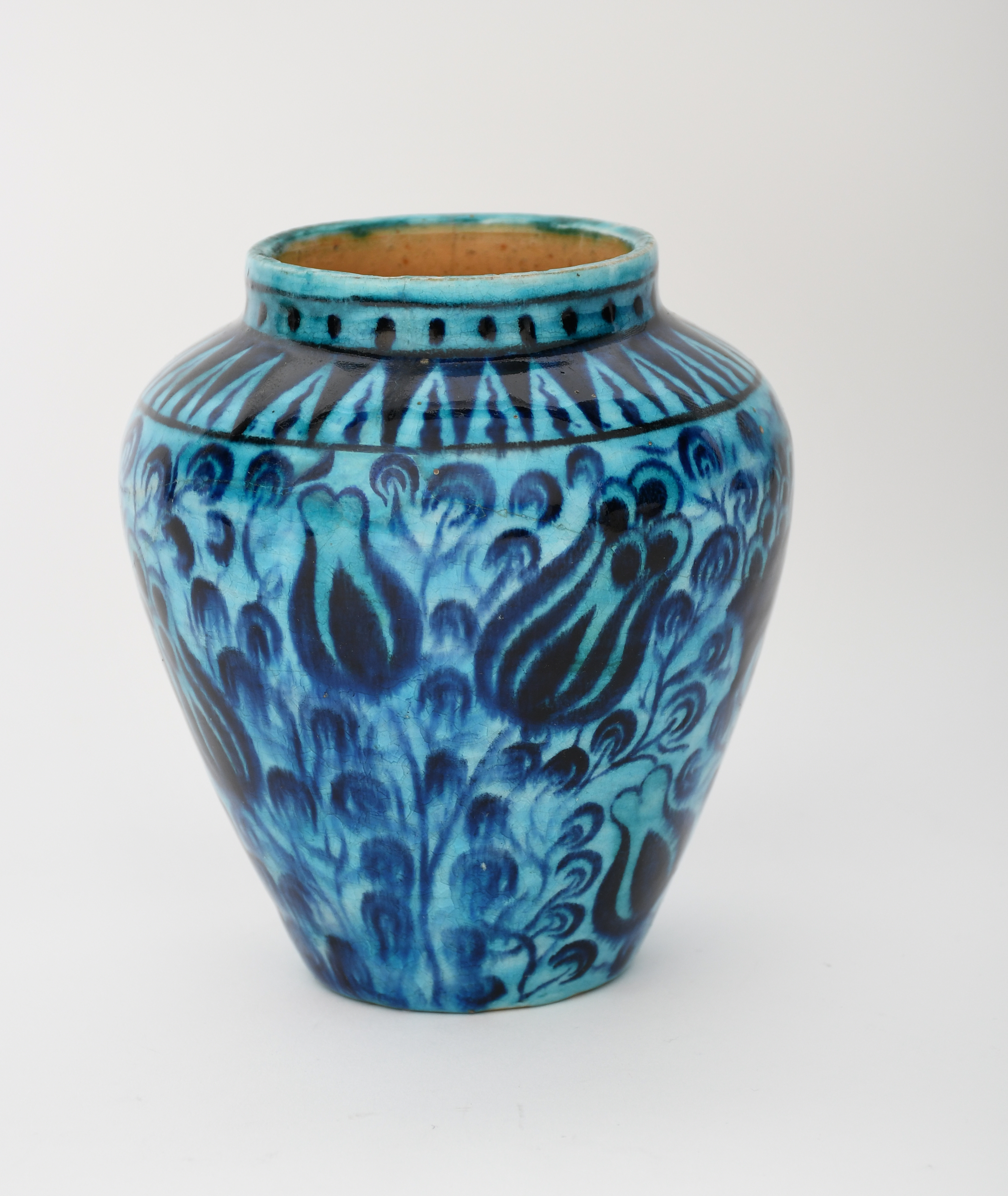A William De Morgan Persian vase, shouldered form, painted with sprays of stylised blue tulips on a turquoise-blue ground, impressed tulip vase and painted 31/2, museum restoration, 13cm. high