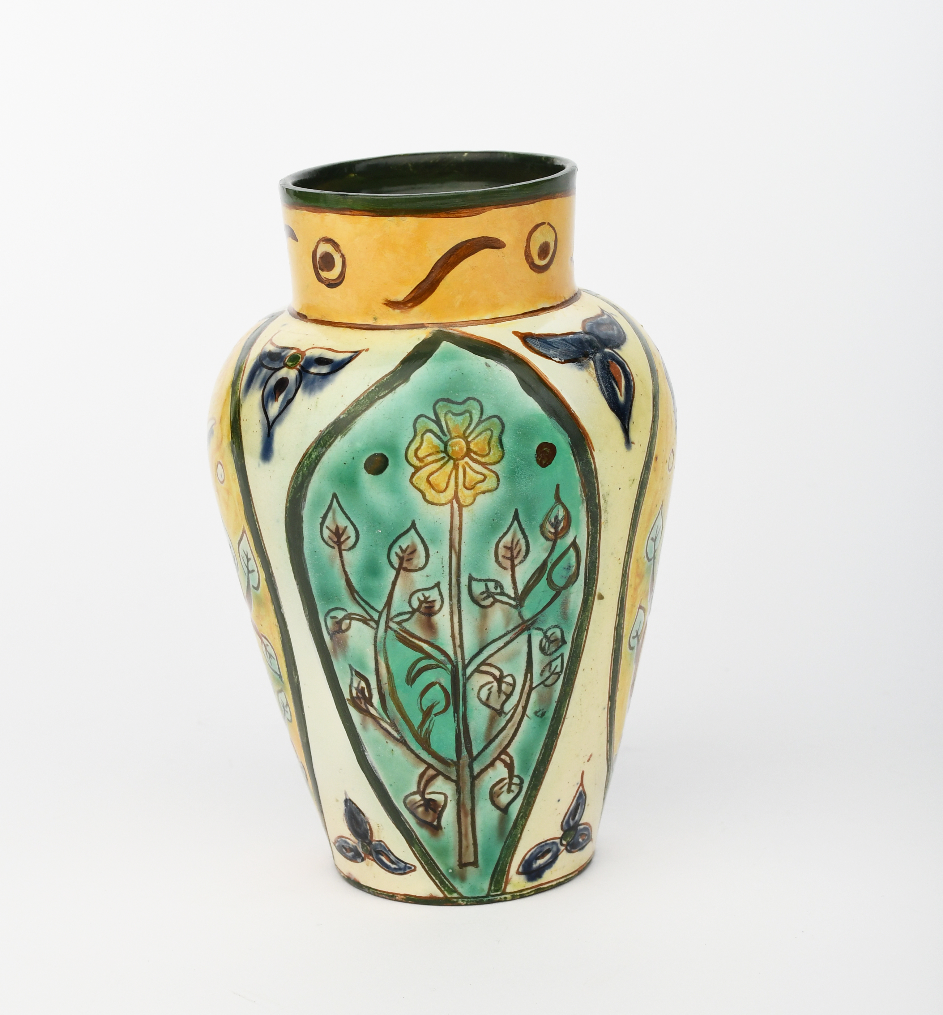 A Della Robbia Pottery vase, shouldered form, incised and painted with panels of stylised flower