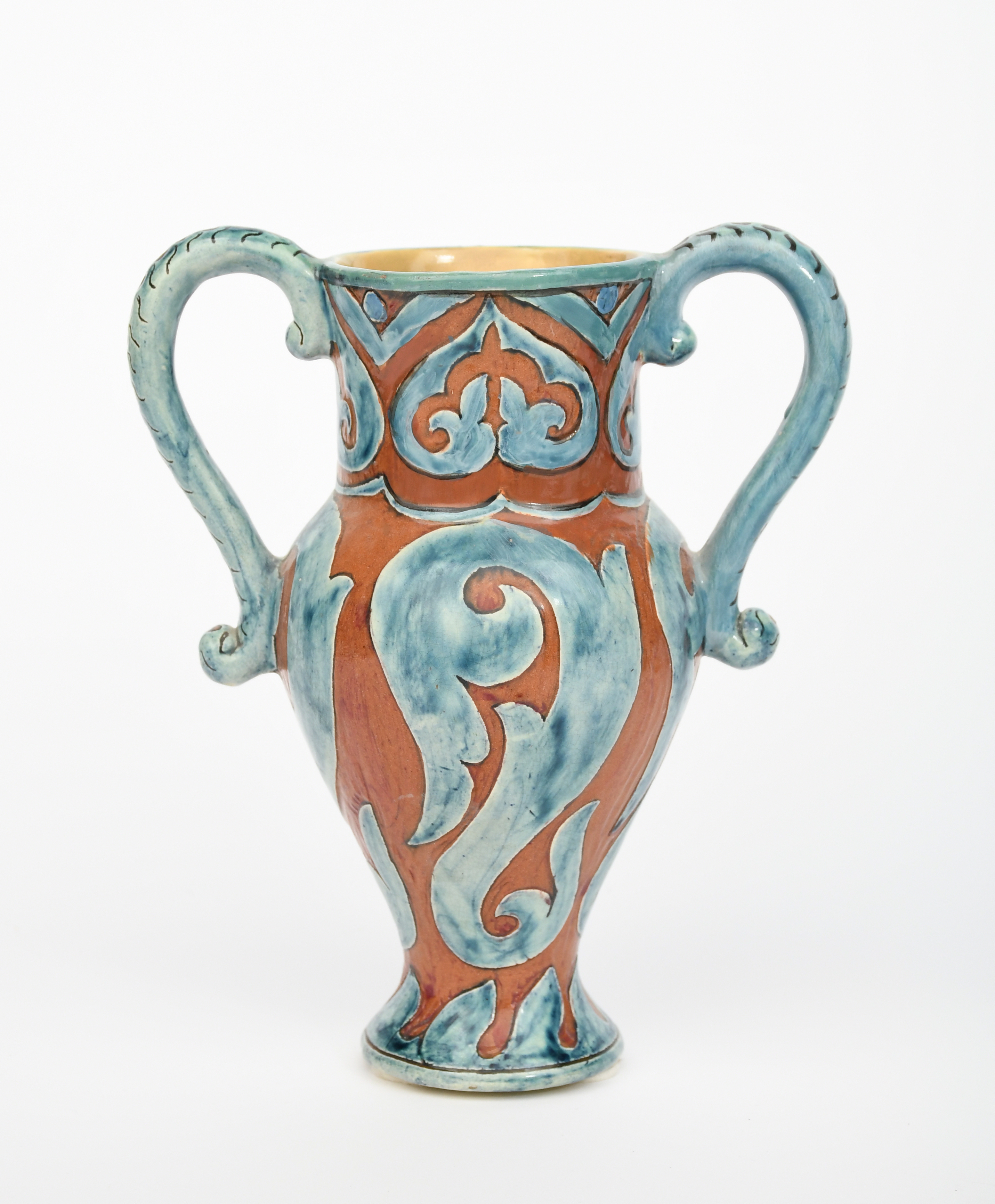 A Della Robbia Pottery vase by John Fogo, shouldered form with applied twin scroll handles, incised with scrolling foliage in blue on a terracotta ground, incised factory mark and JF monogram, museum restored neck, 22cm. high
