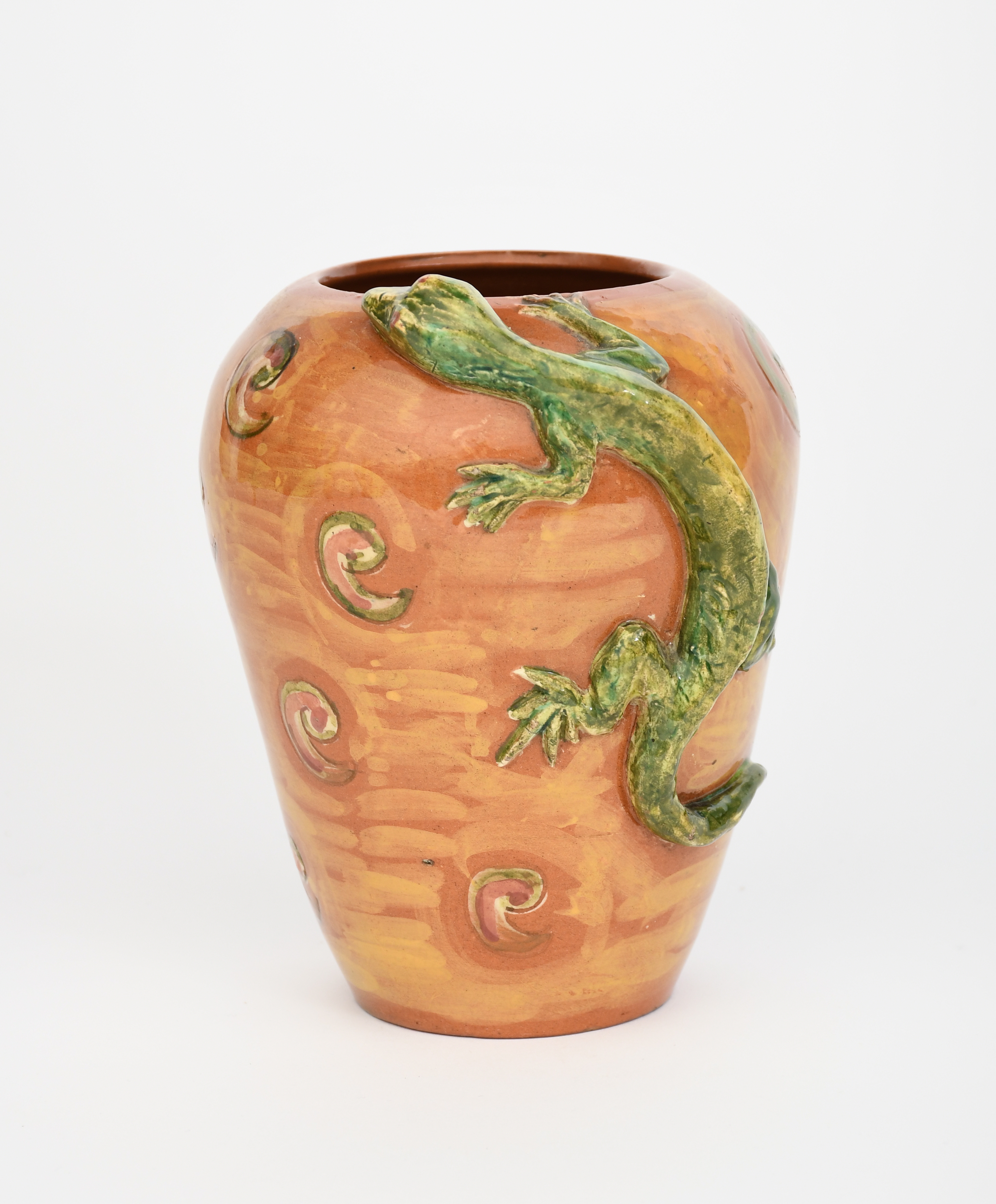 A rare Della Robbia Salamander vase by Harold Rathbone, shouldered form, applied with a lizard to