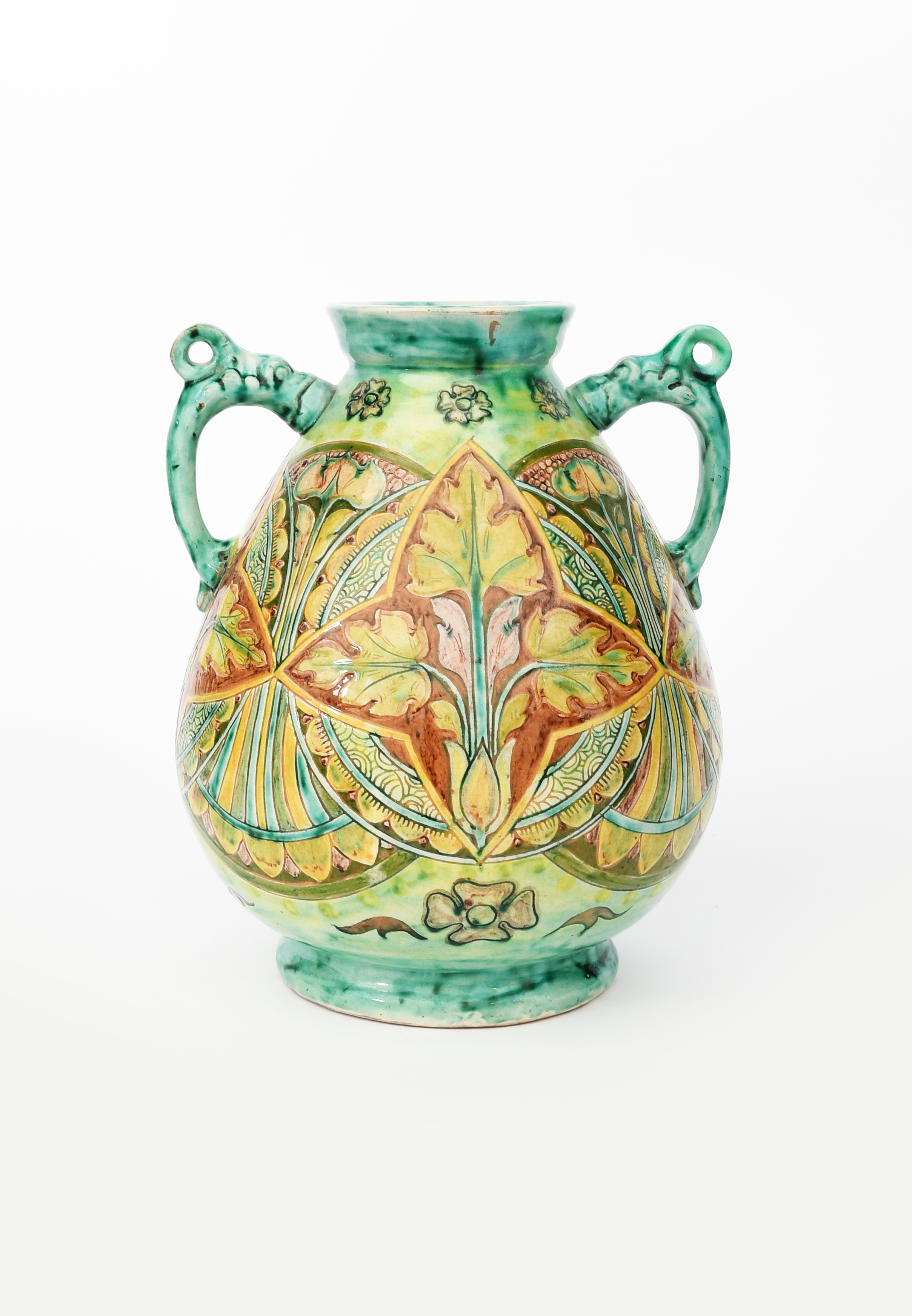 A Della Robbia Pottery Cantagalli vase by Hannah Jones, swollen ovoid form with applied handles, incised and painted with Art Nouveau flower and foliate panels, in green, yellow, pink and ochre, incised factory marks and painted monogram, professional restoration to top rim and one handle, 32cm. high