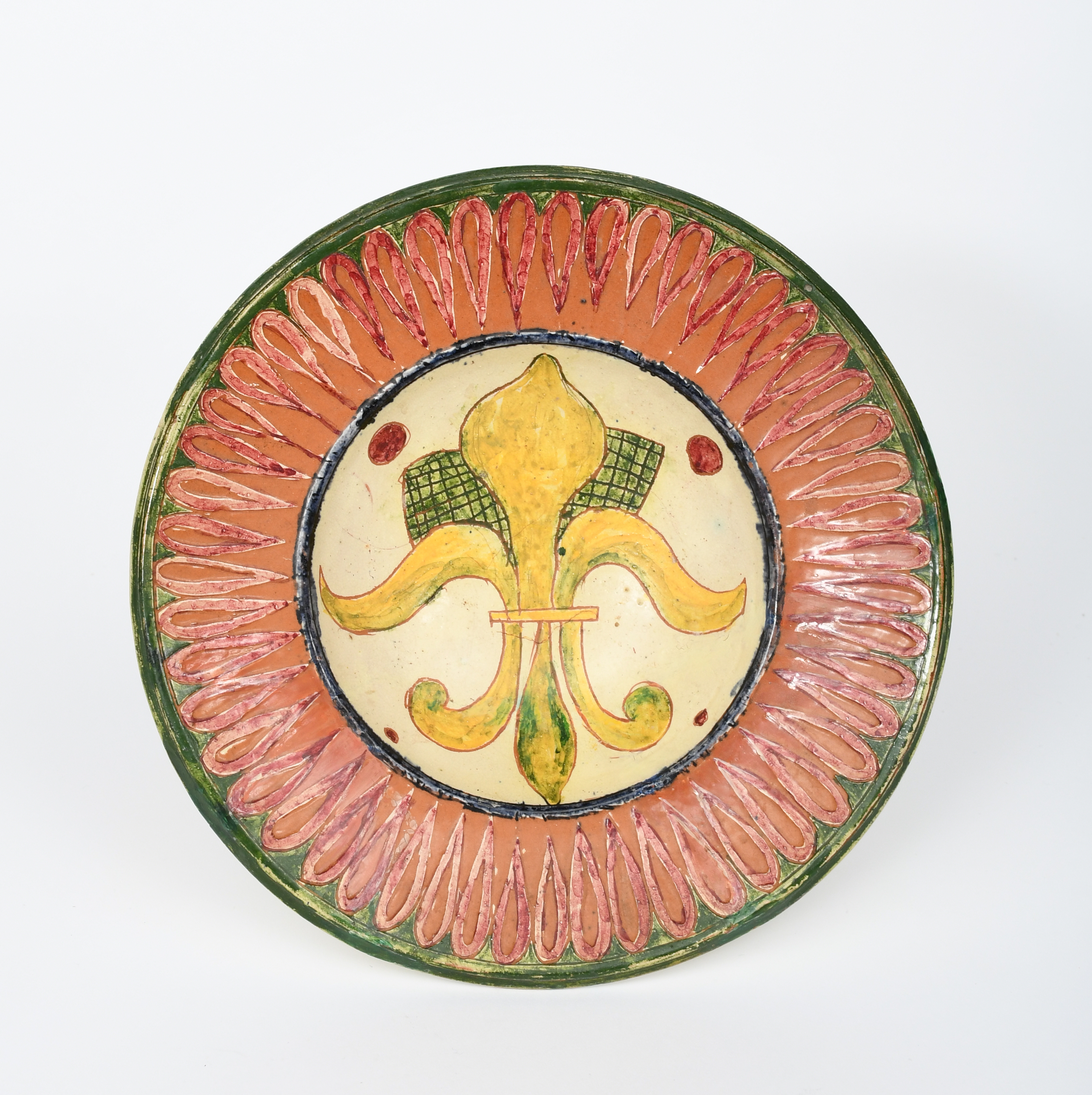 A Della Robbia Pottery plate by Harry Pearce and probably Edward Turri, dated 1895, incised and painted to the well with fleur de lys in yellow, the rim a band of stylised petals in pink, red and green incised factory mark, date and P mark, painted T, restored, 23cm. diam.