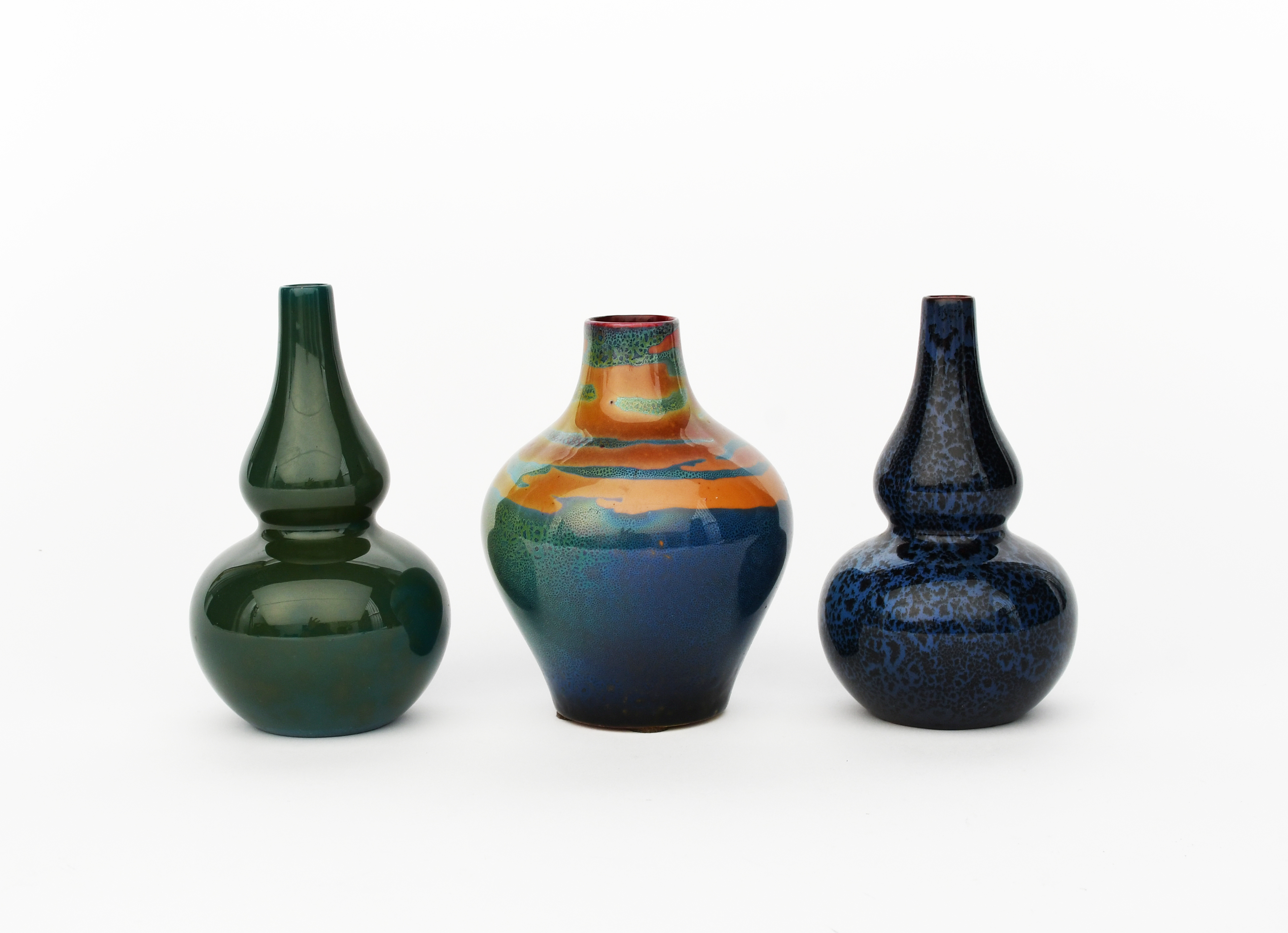 A Royal Doulton Titanian Ware vase, double gourd form covered in a green and blue glaze, another Royal Doulton Flambe double gourd vase glazed mottled blue over flambe and another Royal Doulton Flambe vase printed and impressed factory marks, 15.5cm. high (3)