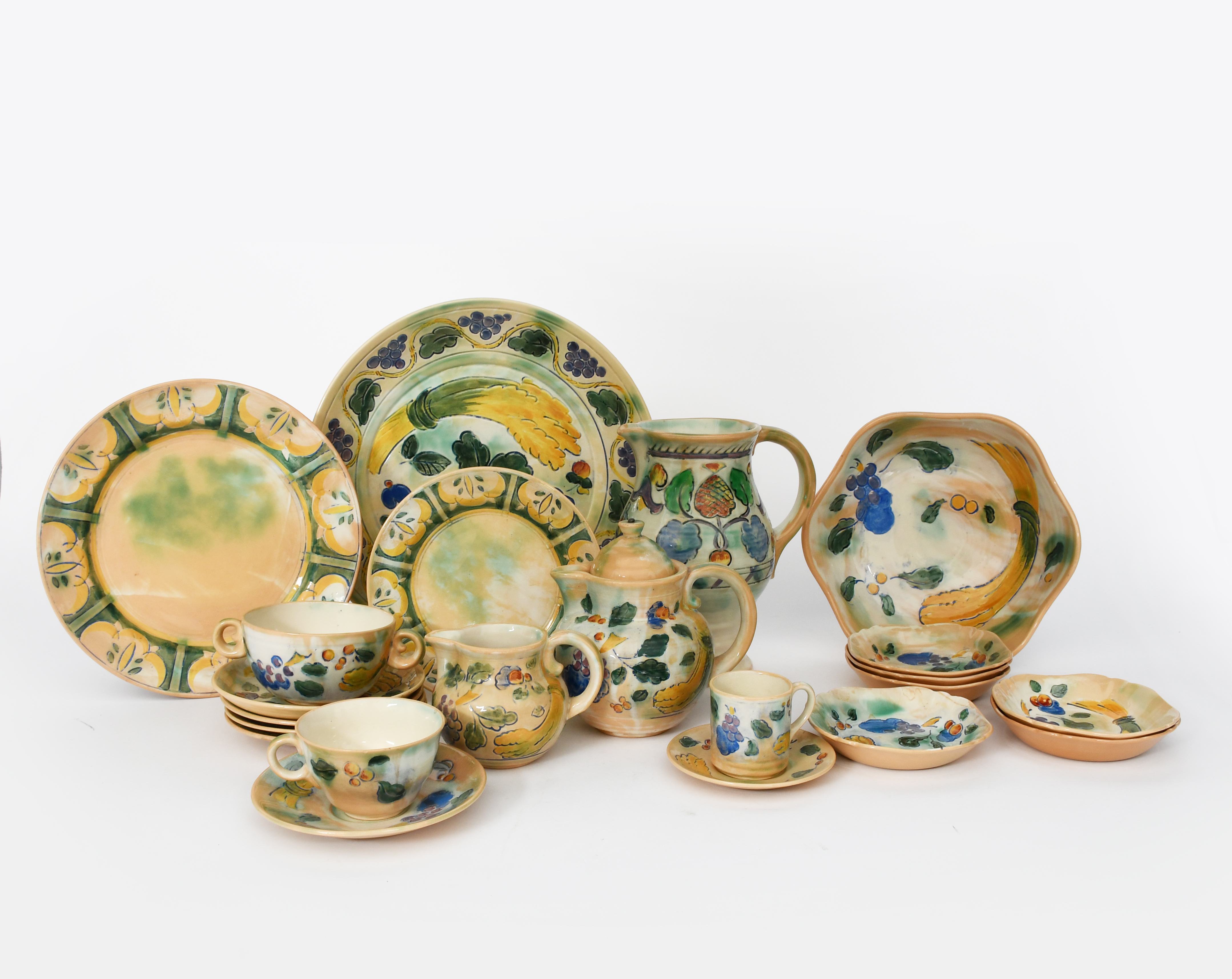 A large Royal Doulton Brangwyn Ware charger designed by Frank Brangwyn, model D.5054, decorated with Harvest motif to the well, the rim fruiting grape vine, in colours on a mottled green and tan ground, and a collection of various Brangwyn Ware comprising covered pot, tall jug, milk-jug, serving bowl and six side bowls, dinner plate and side plate, one tea cup and saucer, coffee can and saucer, one twin-handled soup bowl and four saucers, printed and painted factory marks, 32cm. diam. (23)