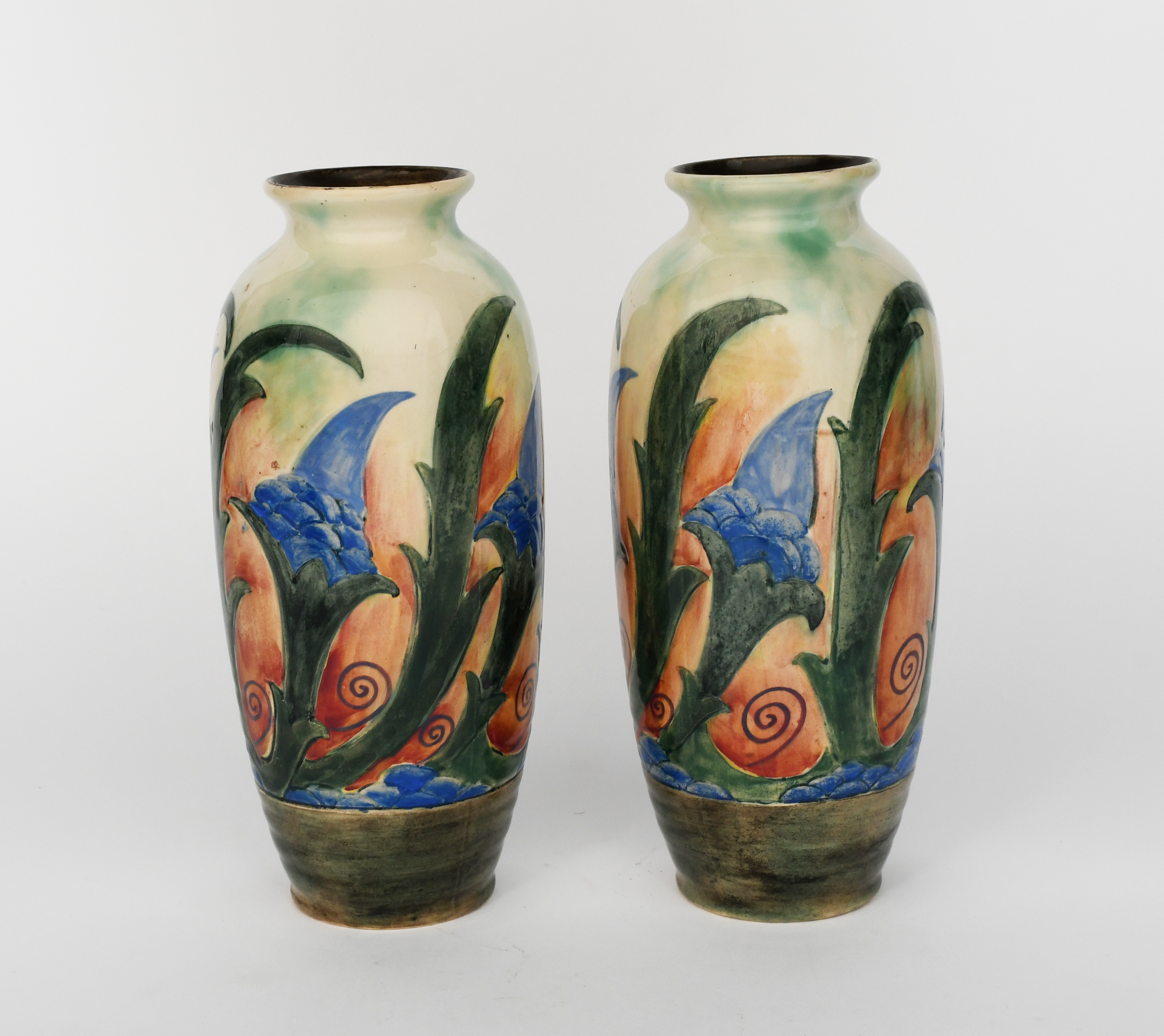 A pair of Royal Doulton Brangwyn Ware vases designed by Sir Frank Brangwyn, pattern D.5081, slender, shouldered cylindrical form, decorated with scrolling flower and foliage frieze in blue green and aubergine on a graduated orange to green ground, printed and painted factory marks, 29.5cm. high (2)