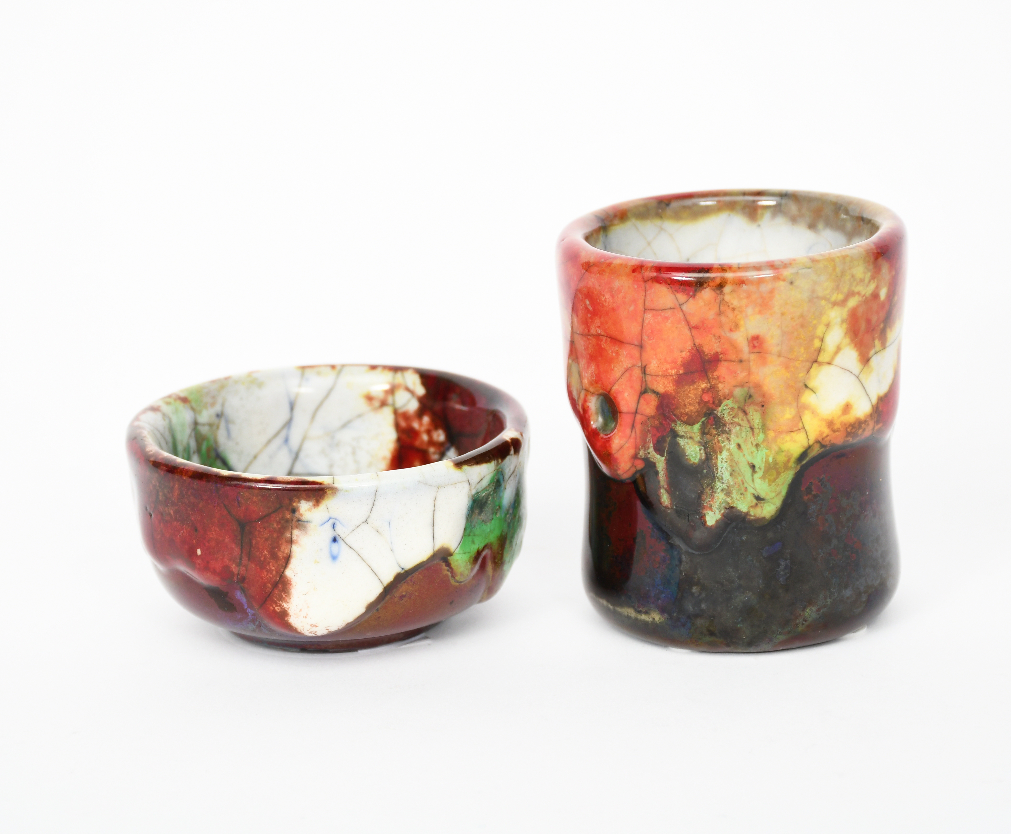 A Royal Doulton Chang beaker vase designed by Charles Noke and Harry Nixon, covered in a thick white and flambe glaze with green and yellow patches, and a small Royal Doulton Chang bowl, painted Royal Doulton Chang and Noke, 8.5cm. high (2)