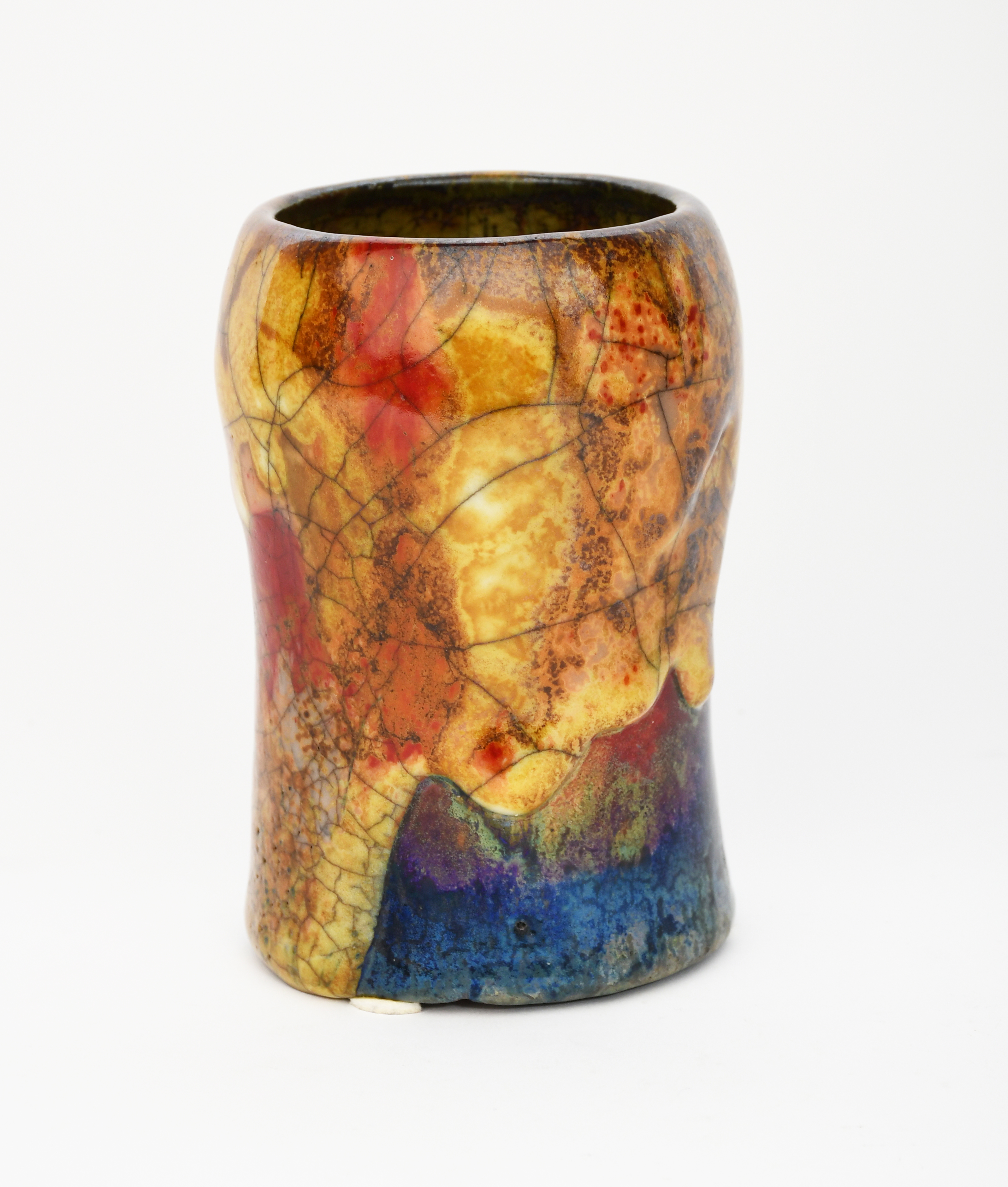 A Royal Doulton Chang vase by Charles Noke and Harry Nixon, waisted, cylindrical form, covered in a running white and flambe glaze under yellow, with blue patches, painted Royal Doulton, Noke and HN monogram, 16cm. high