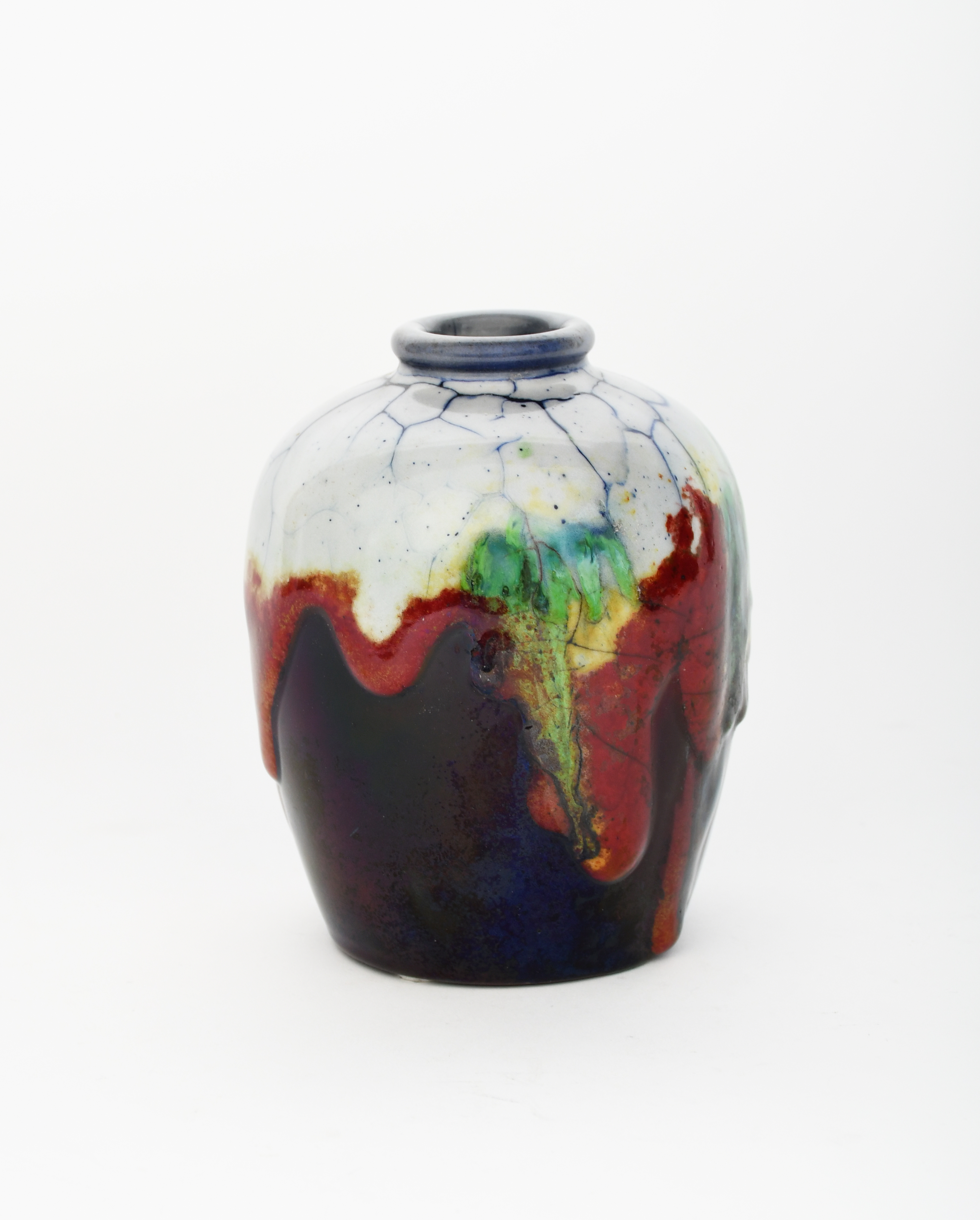 A Royal Doulton Chang vase by Charles Noke and Harry Nixon, shouldered form, covered in a running white and flambe glaze with green, yellow and blue patches, printed factory mark, painted Chang, Noke and HN monogram, 16cm. high