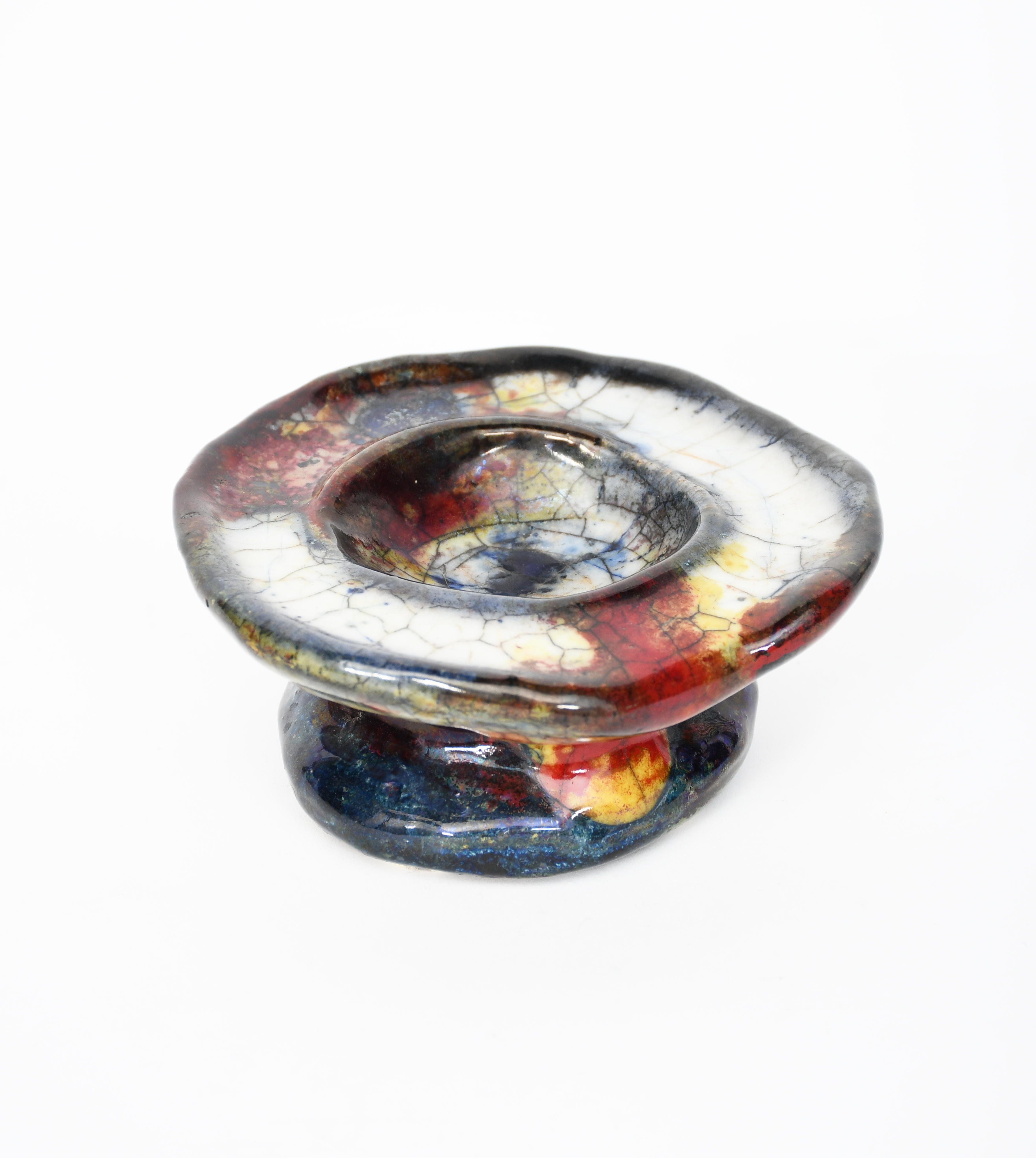 A Royal Doulton Chang mushroom dish designed by Charles Noke and Harry Nixon, amorphic form, covered in a thick running white and flambe glaze with yellow and blue patches, painted Doulton mark, Noke signature and HN monogram, 13cm. diam. 5cm. high