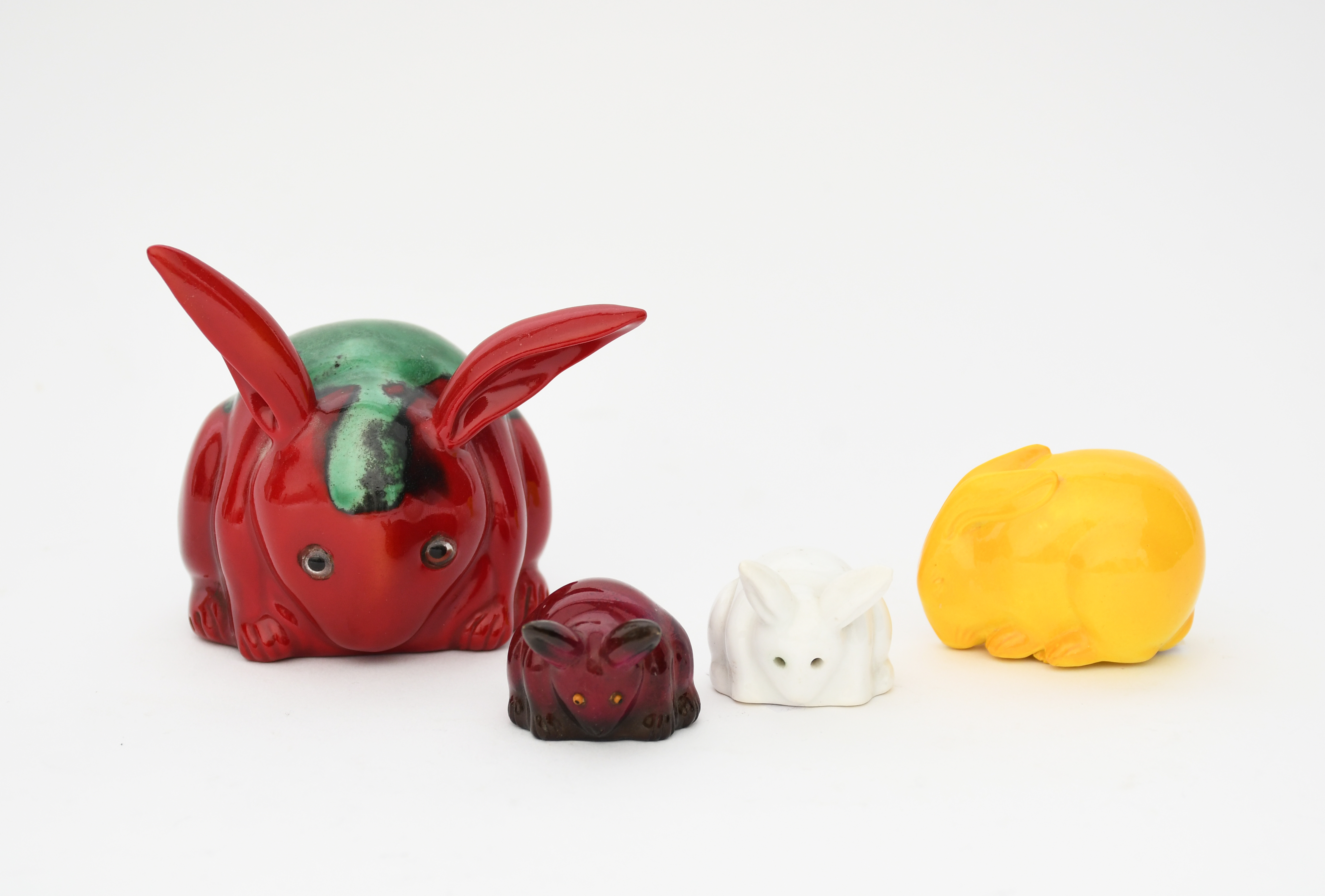A Bernard Moore flambe model of a rabbit, flambe with green glazed patch, applied glass eyes, a Royal Worcester rabbit netsuke figure glazed yellow and two small rabbits, printed BM monogram to main, 7.5cm. high (4)