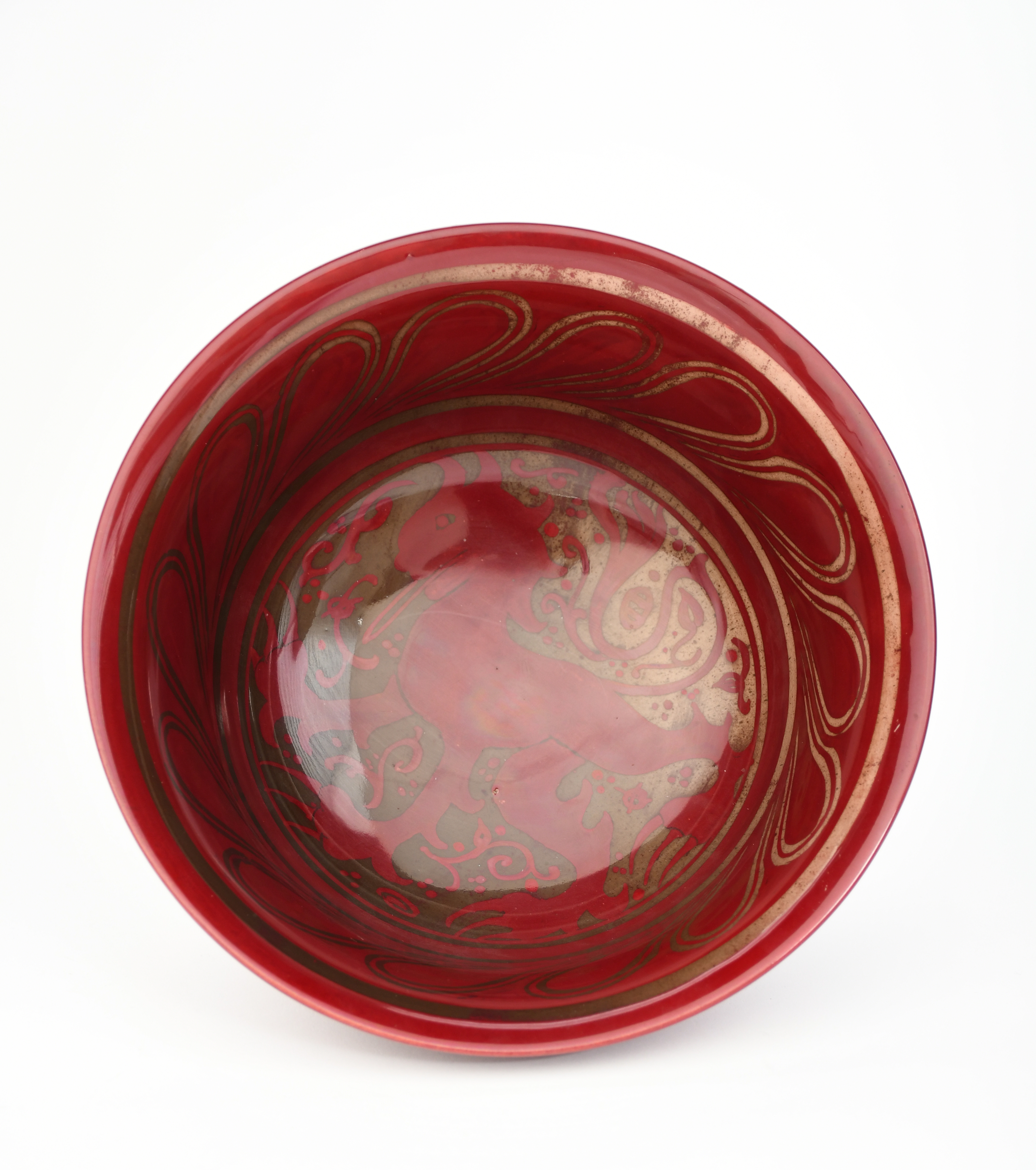 A Bernard Moore flambe footed bowl, painted to the well with a heraldic lion, in red flambe, signed Bernard Moore, 23cm. diam.