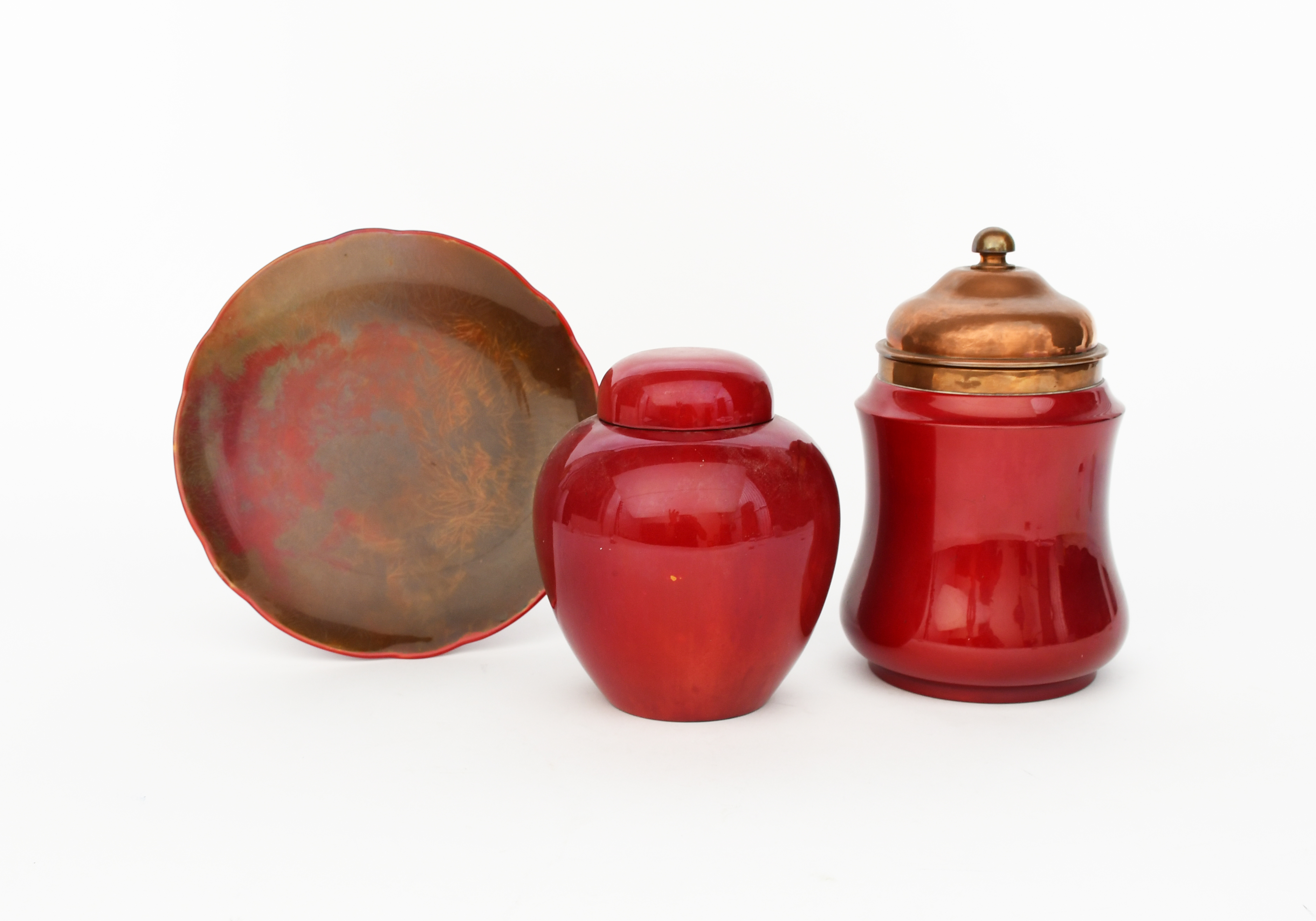 A Bernard Moore flambe jar with copper mount and cover, covered in a flambe glaze, a Bernard Moore flambe ginger jar and cover and a Bernard Moore plate covered with a crystalline glaze signed Bernard Moore, 22cm. high (5)