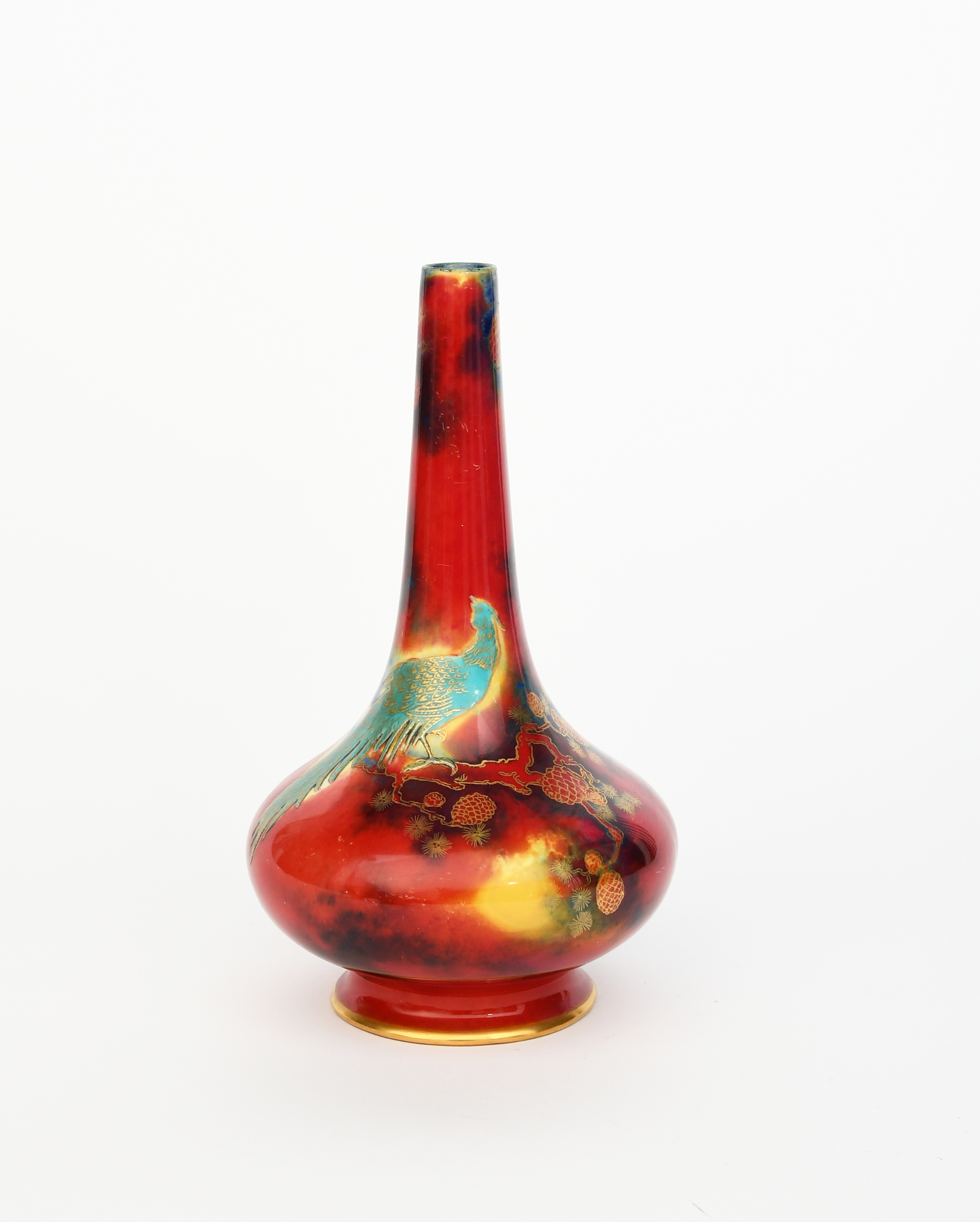 A Bernard Moore Pottery flambe solifleur vase, the compressed, footed body with tall tapering cylindrical neck, enamelled in colours with an exotic bird perched on a fir tree bough, highlighted in gilt on a red flambe ground, printed Bernard Moore mark, light wear, 24cm. high