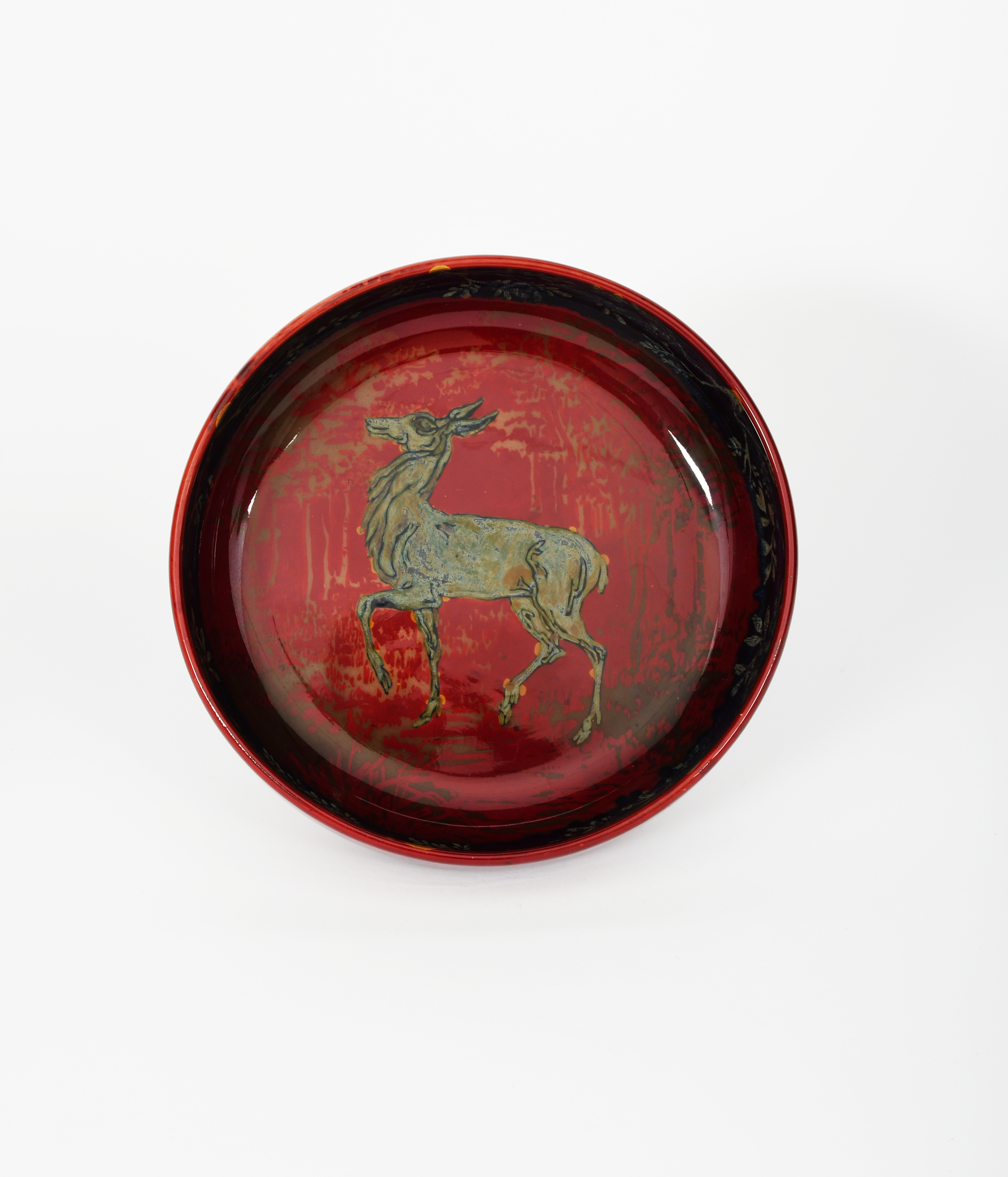 A Bernard Moore flambe bowl, decorated to the well with a deer walking in a woodland setting, in