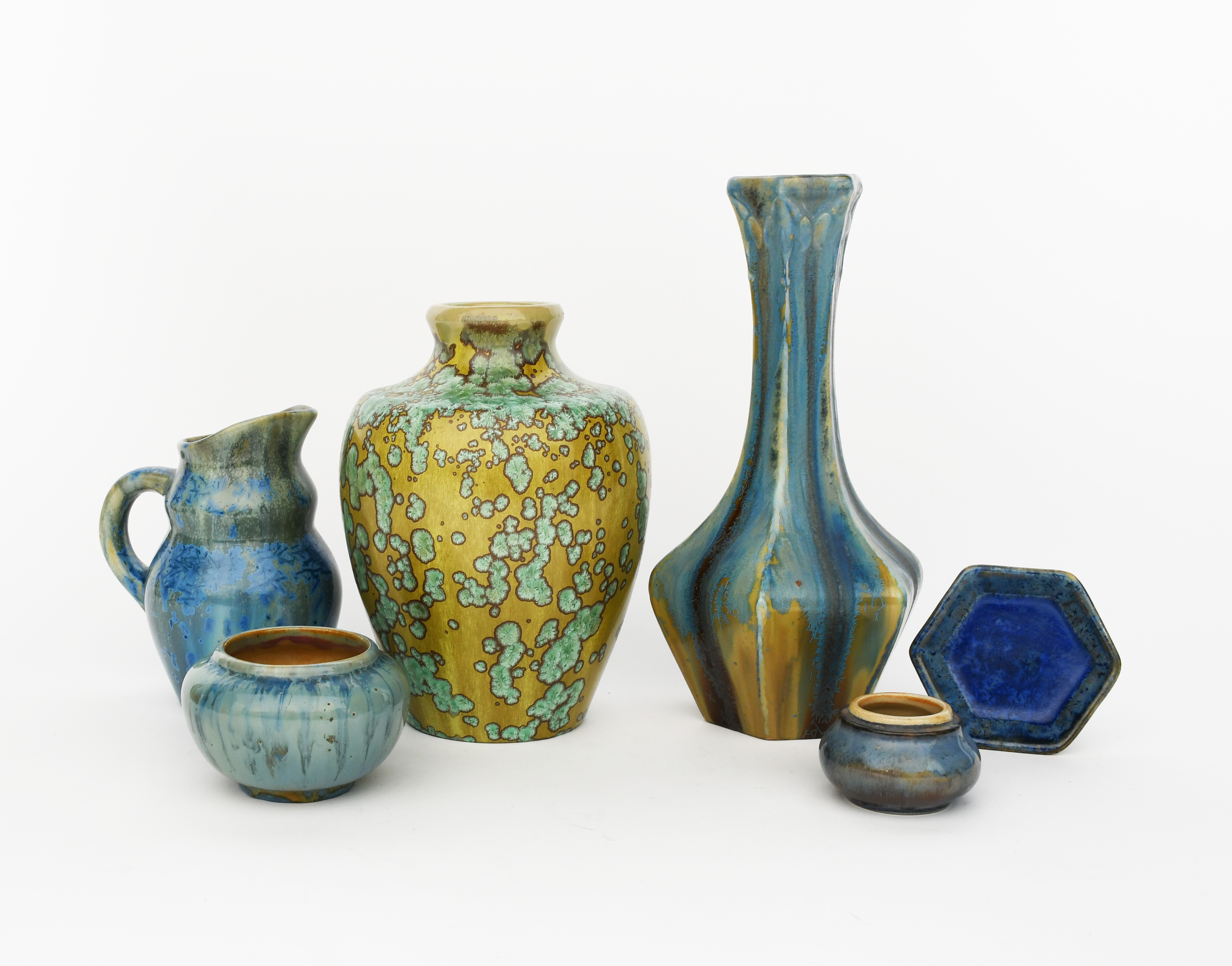 A Pierrefonds stoneware crystalline glaze vase, shouldered form, covered in a turquoise crystalline glaze over green, a Pierrefonds hexagonal vase, a jug and three others impressed marks, 20.5cm. high (6)