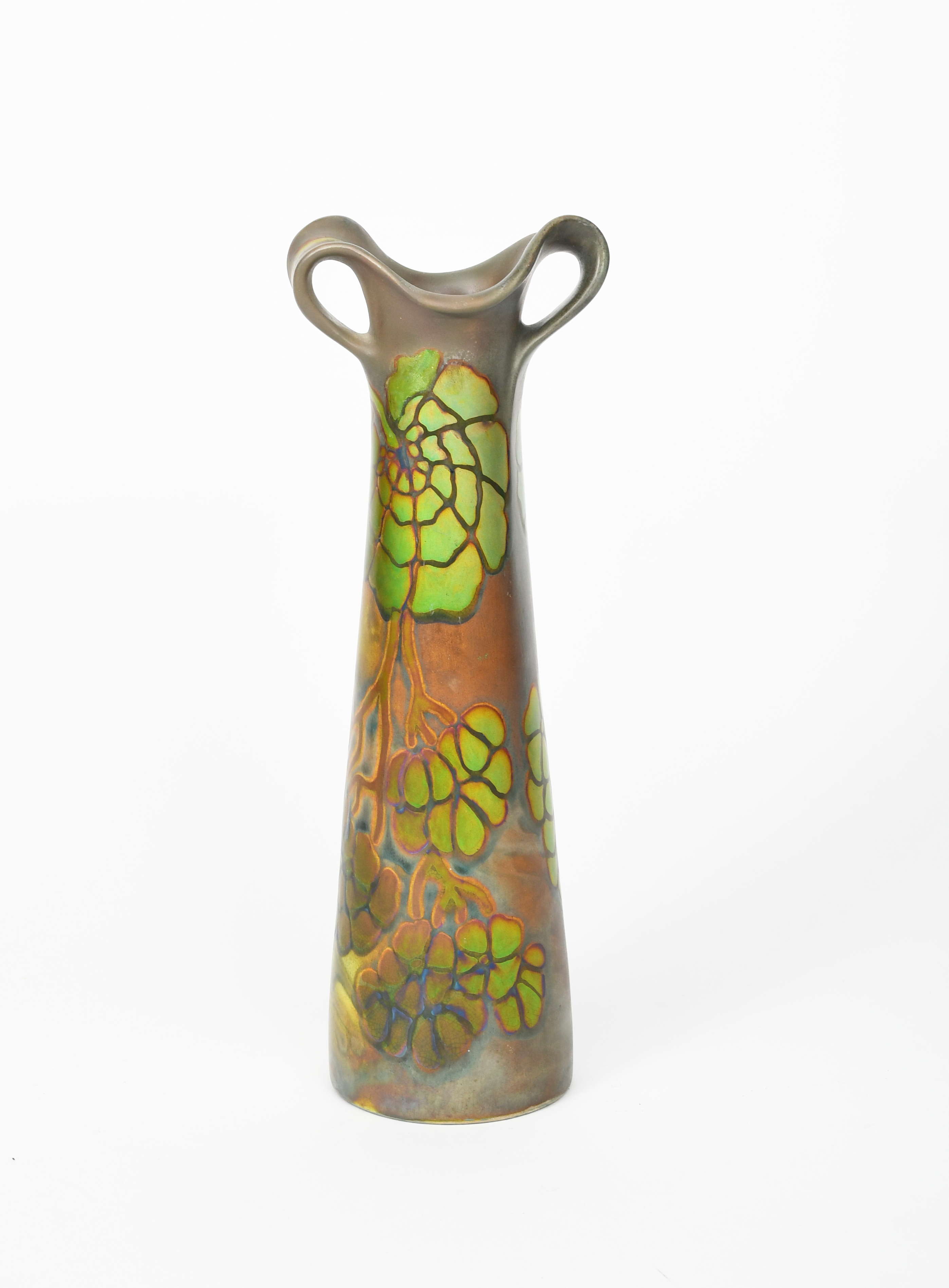 A Zsolnay Pecs vase designed by Tádé Sikorski, shape no.6085, twin-handled, tapering cylindrical vase painted with Art Nouveau flowers and foliage, in gold and green lustre, impressed Zsolnay mark, professional restoration to neck, 30cm. high