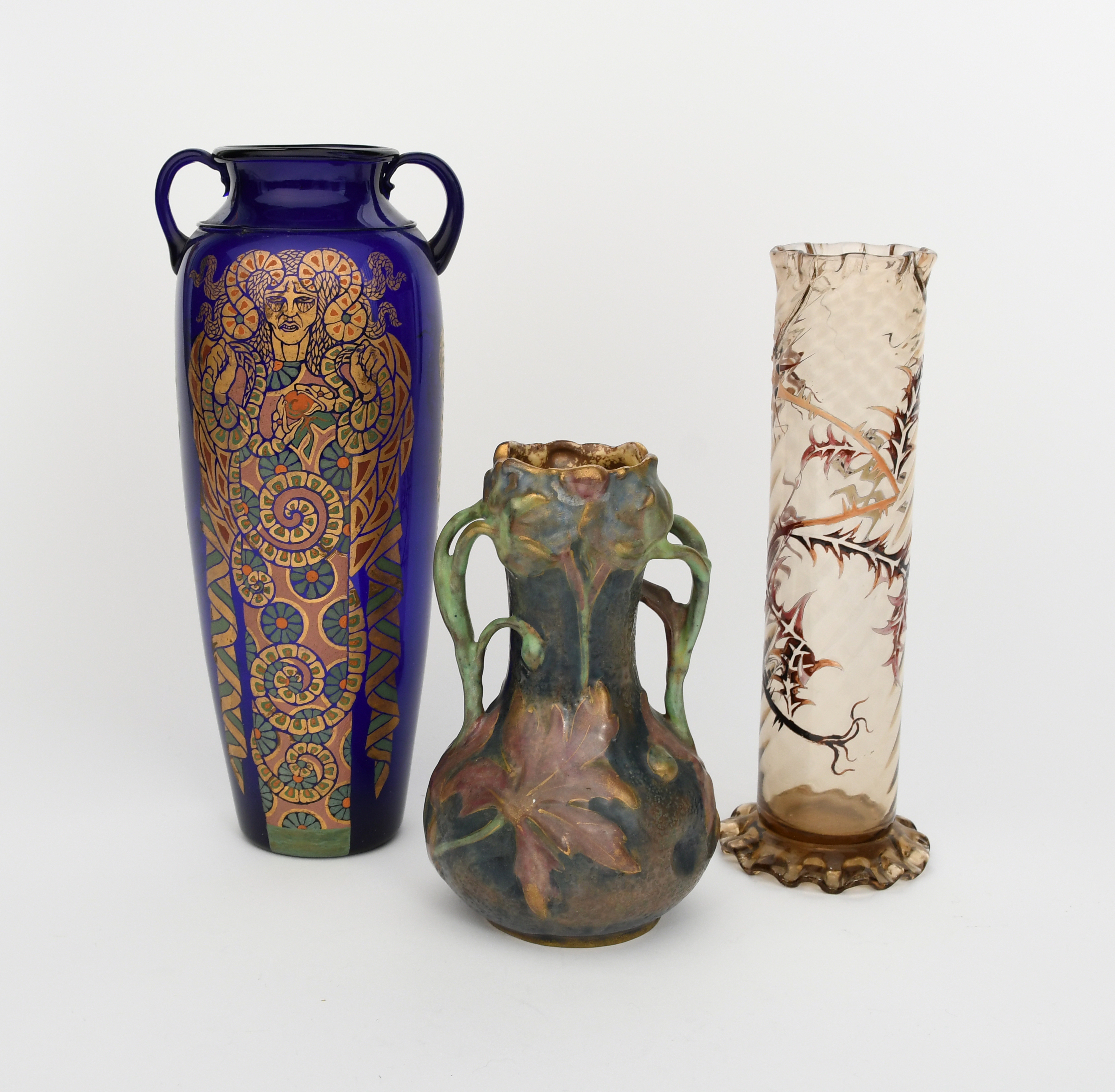 An Art Nouveau Amphora Pottery vase, ovoid with swollen neck, cast in low relief with Art Nouveau foliage stems, in colours, highlighted in gilt, an early Emile Galle enamelled glass vase, an Austrian iridescent glass bowl, a Secessionist enamelled glass vase, a Liberty Tudric Pewter dish designed by Archibald Knox and two continental pewter pieces impressed factory marks, Galle vase repaired,19cm. high (7)