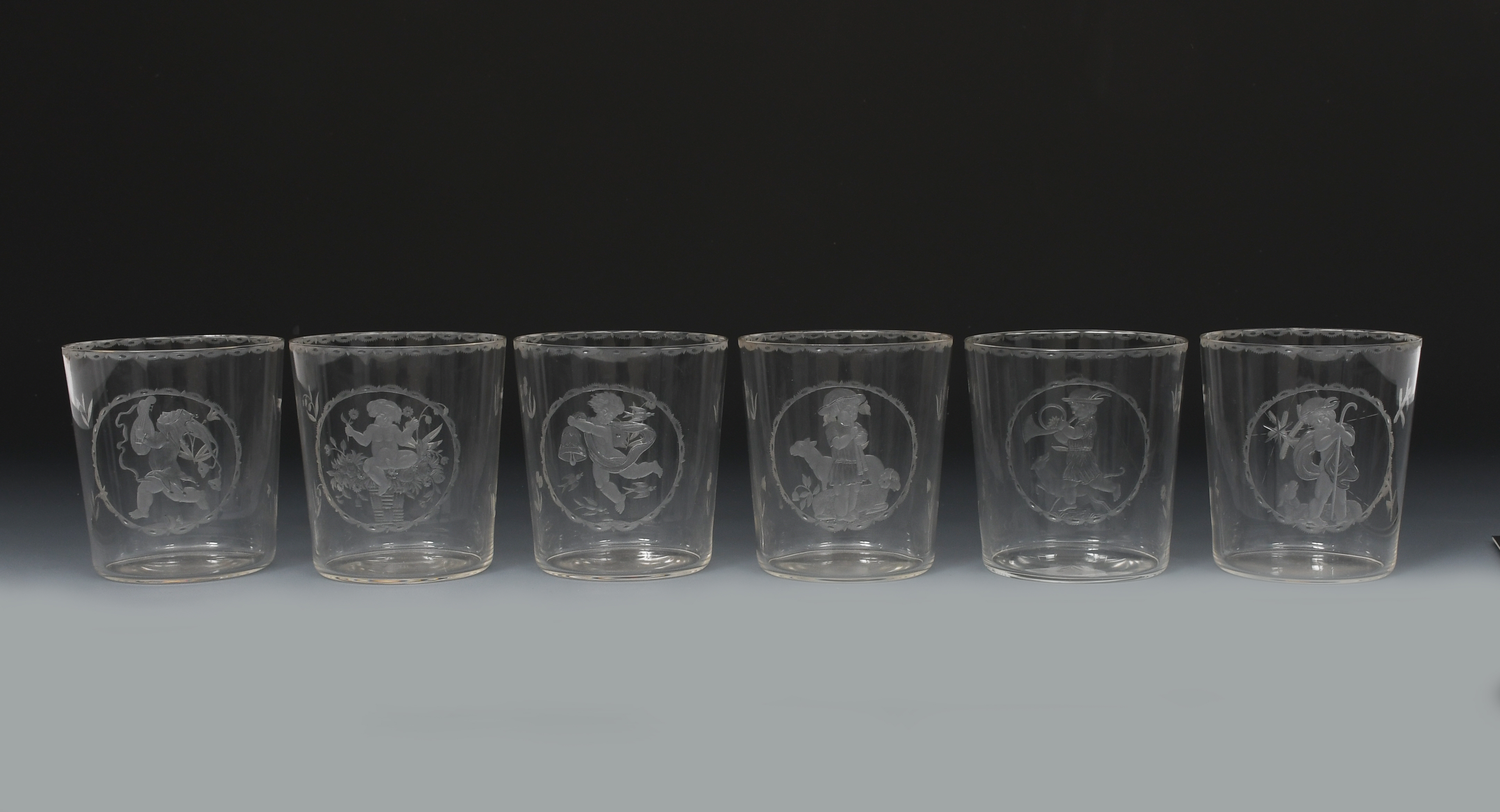 A set of six Lobmeyer engraved vases designed by Michael Powolny, flaring cylindrical form, engraved with a roundel depicting a young child, four playing musical instruments, one sitting in a display of flowers, one with a sheep, the reverse engraved with simple flower stems, etched Lobmeyer mark, 8.5cm. high (6)