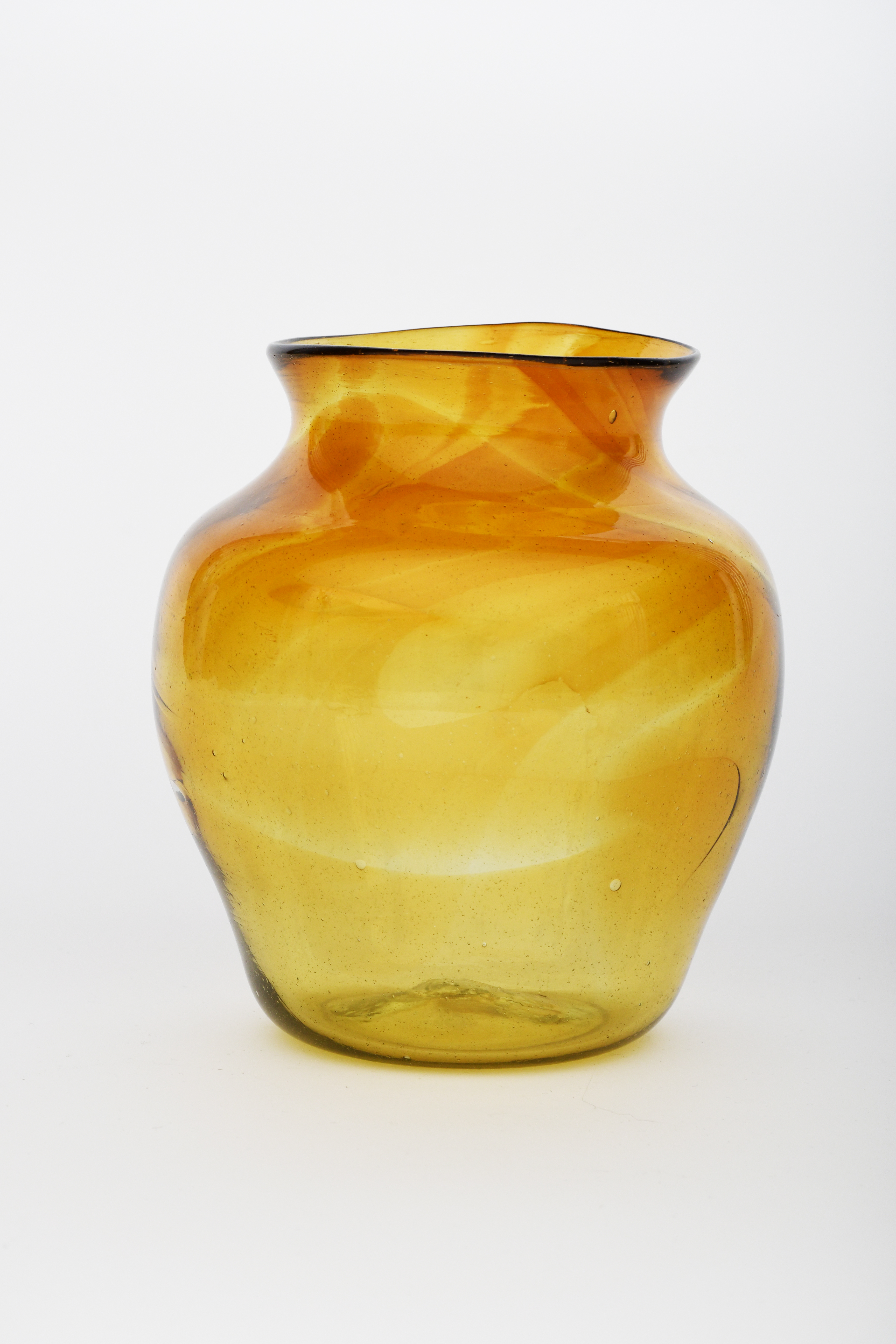 A James Couper & Sons Clutha glass vase possibly designed by Dr Christopher Dresser, shouldered form with flaring rim, amber glass with striations and air bubble inclusions, unsigned, 18cm. high