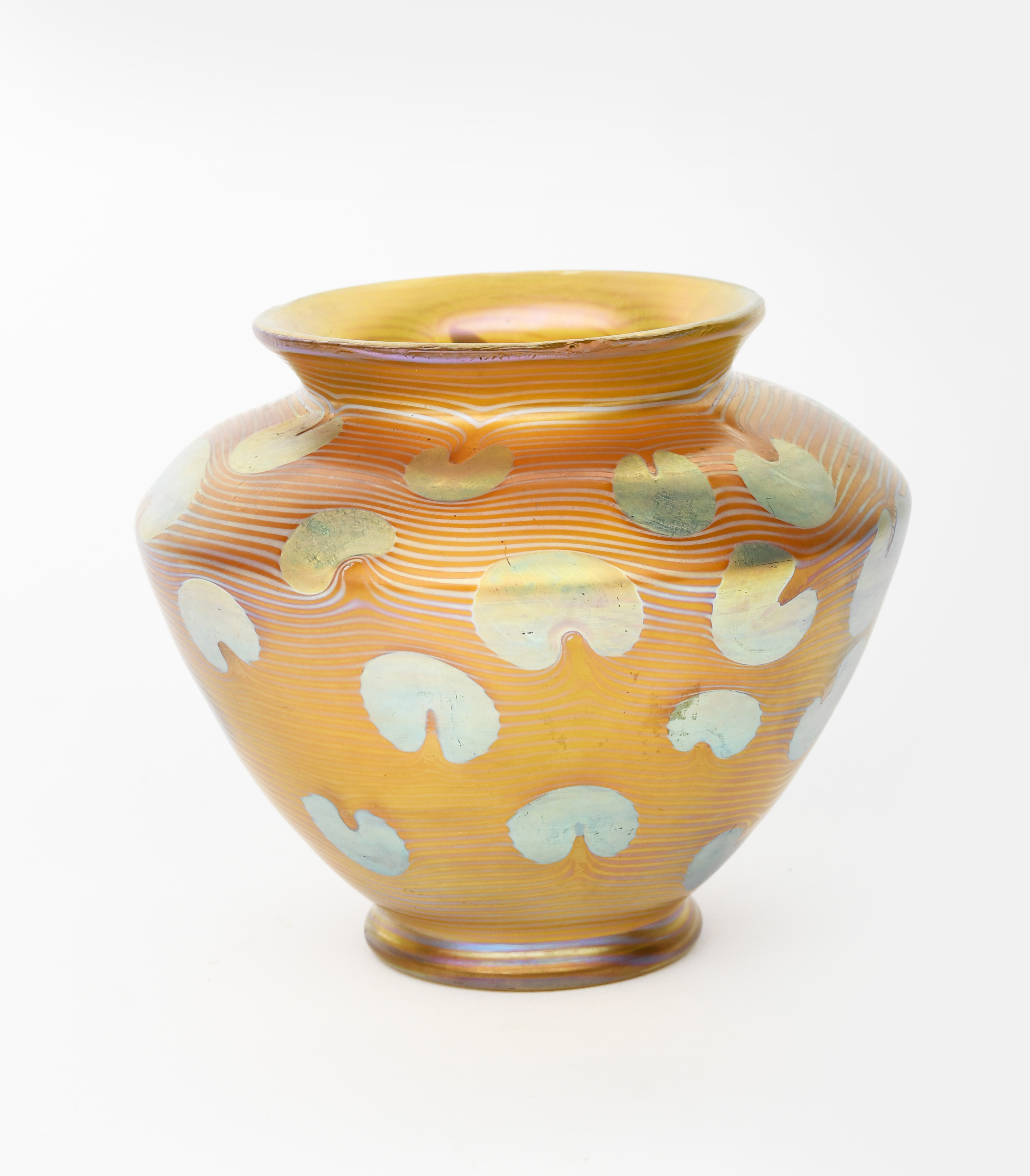 A rare Loetz Phanomen glass vase, shouldered swollen form, surface decorated with Art Nouveau geometric design of circular splashes on fine banding in golden iridescence, signed Loetz Austria to foot, 16cm. high