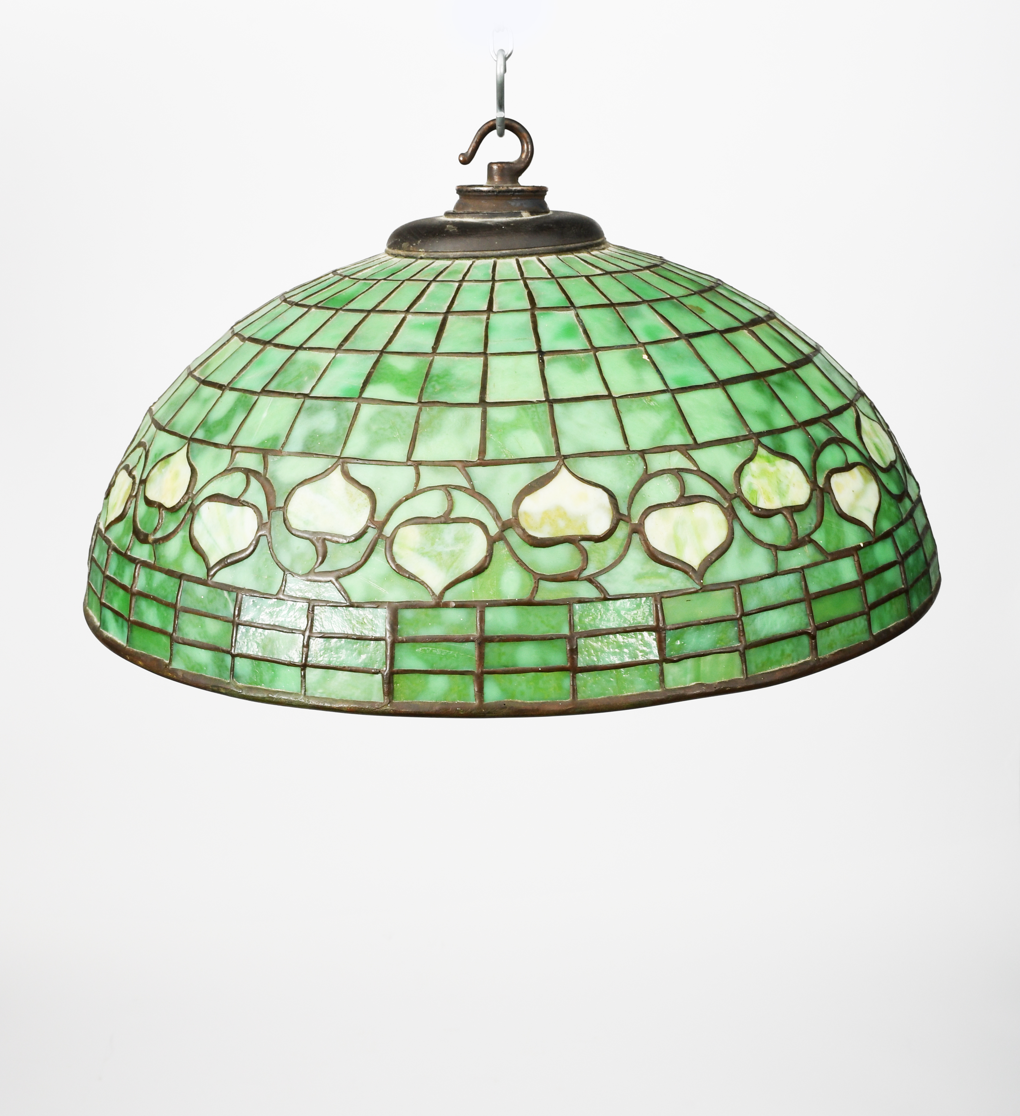 A Tiffany Studios Vine border leaded glass shade, model no.1435-76, green glass, with later hanging